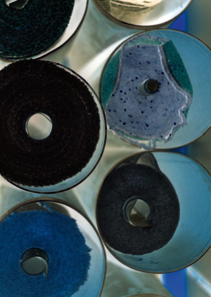 In the pages, elements such as abrasive wheels lined up in a workshop appear as an industrial archive, where the circles seem immobile yet full of potential, evoking a past ready to be reactivated. Other images transform worn work surfaces into surfaces resembling pictorial maps, accumulating traces of time.