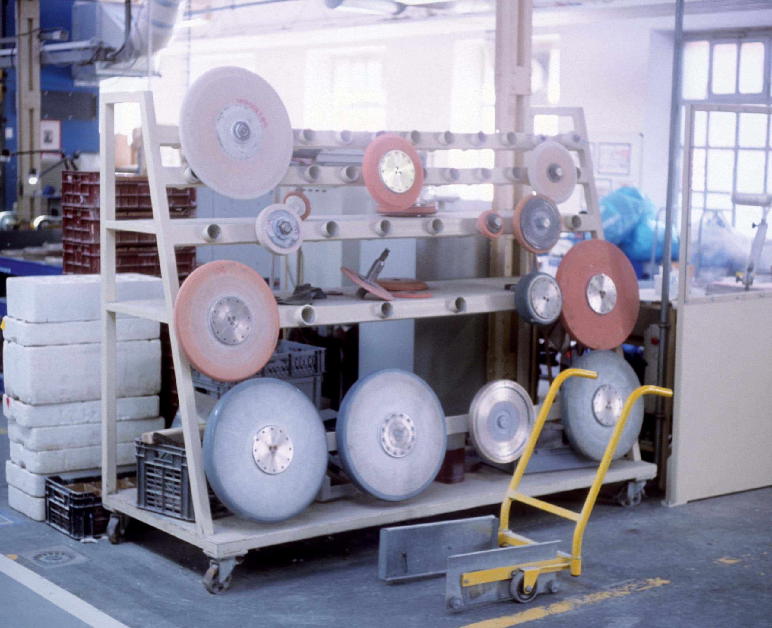In the pages, elements such as abrasive wheels lined up in a workshop appear as an industrial archive, where the circles seem immobile yet full of potential, evoking a past ready to be reactivated. Other images transform worn work surfaces into surfaces resembling pictorial maps, accumulating traces of time.