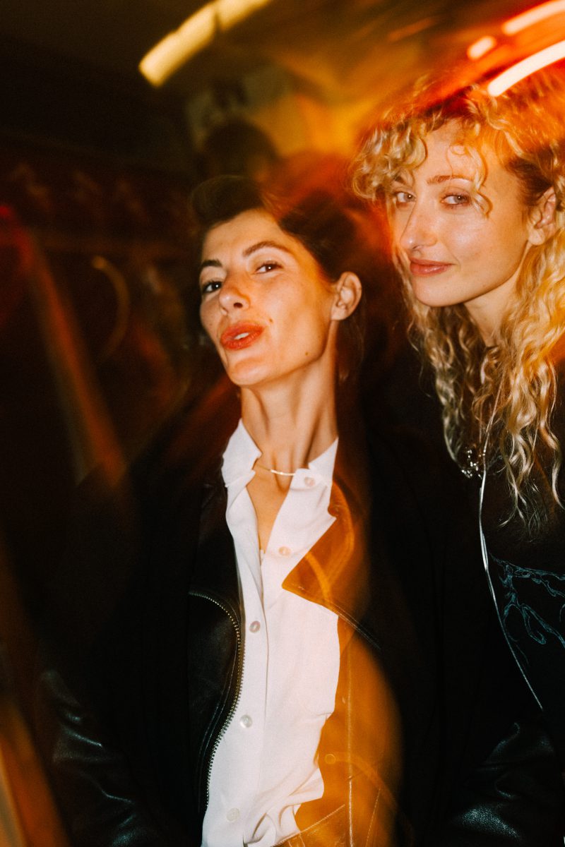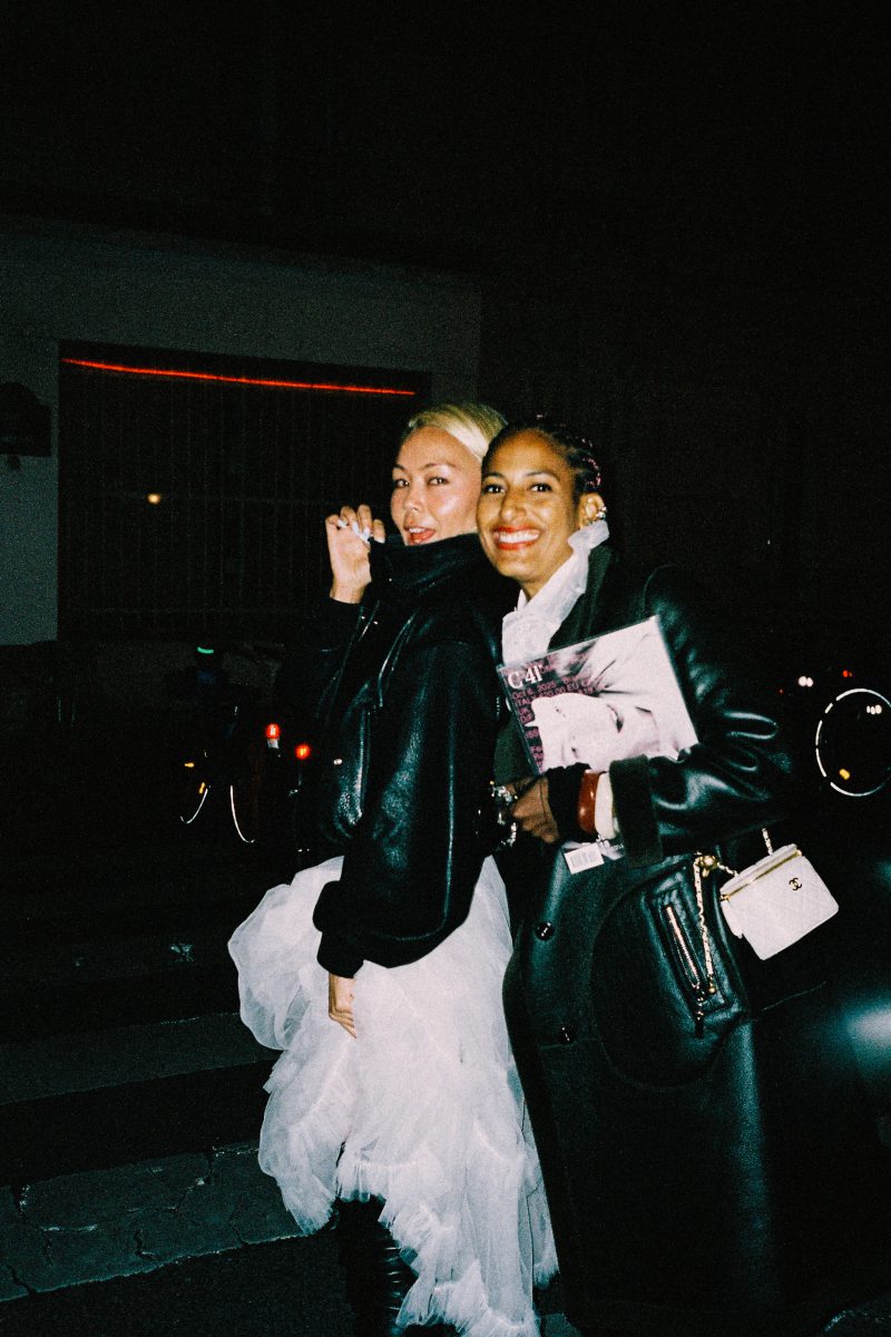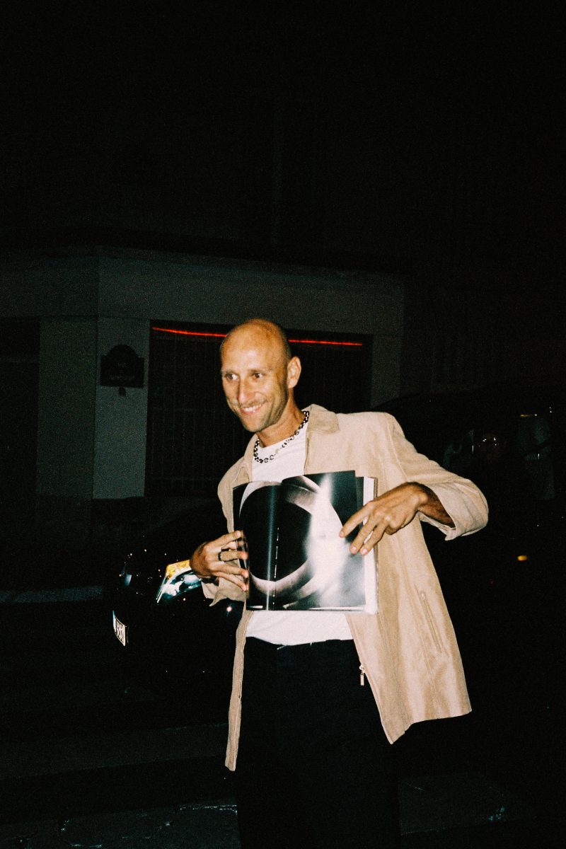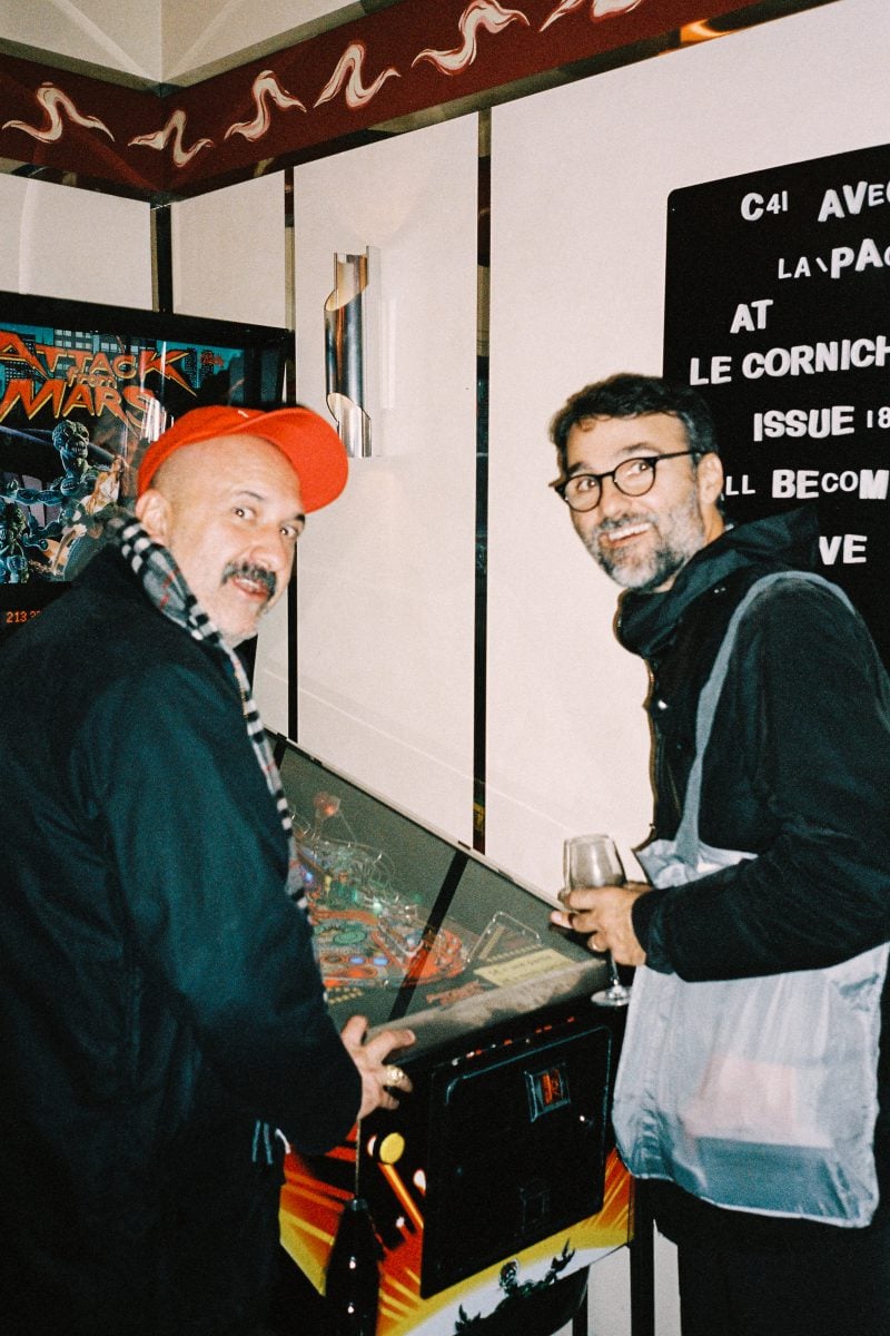 The bar feels like an extension of the editorial office: glasses beside open copies, phones capturing details, hands underlining captions. An editor points to a spread as if it were a layout on a monitor; a photographer shoots the neon reflection on the cover; a stylist notes a name in the white margin. The magazines move from group to group: circulation instead of presentation. No speeches, no microphone. Just pages, plates, glasses.