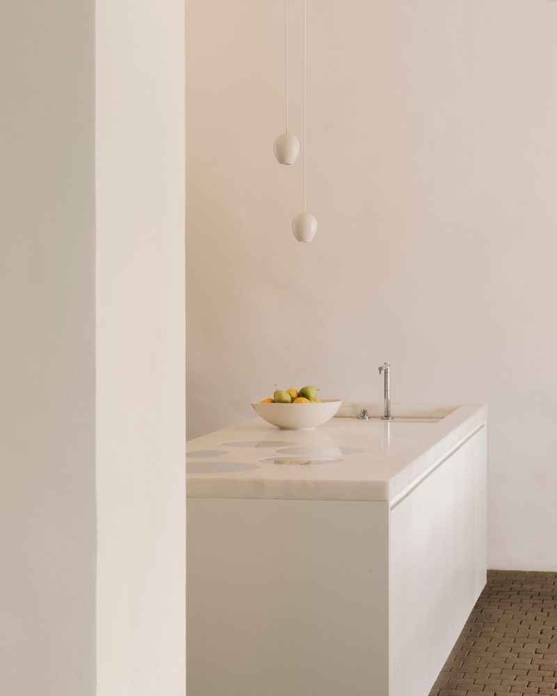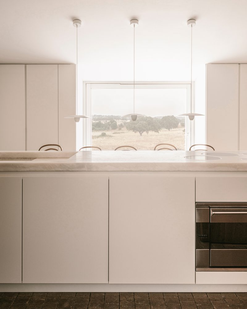 The house, designed by architect Manuel Aires Mateus and owned by the family of João Rodrigues, seems to rise from the landscape as naturally as the wild plants that surround it. White, handle-free, and minimalist to the point of being transparent, Arclinea’s Thea kitchen has no rush, only the desire to live in harmony with its environment.