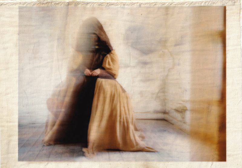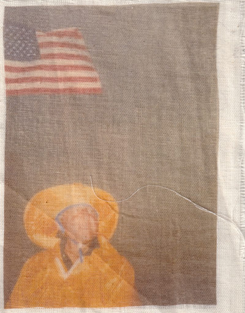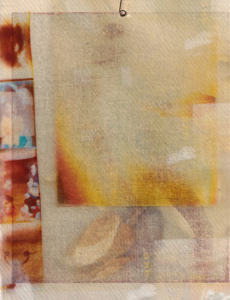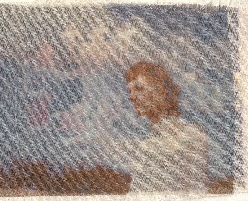 These images are repeatedly processed through cycles of printing and scanning, allowing them to accumulate visual residue in the same way memories gather distortion each time they are recalled. Many prints are transferred onto muslin adhered to cardstock before the fabric is peeled away, leaving a ghostlike impression behind. The muslin layer is then suspended slightly in front of the transfer print, producing a doubled image that appears fused from afar but separates upon closer inspection. Additional materials like mulberry paper, tracing paper, and transparency film, create translucent layers that resemble fading afterimages.