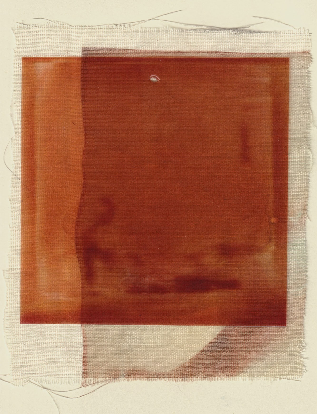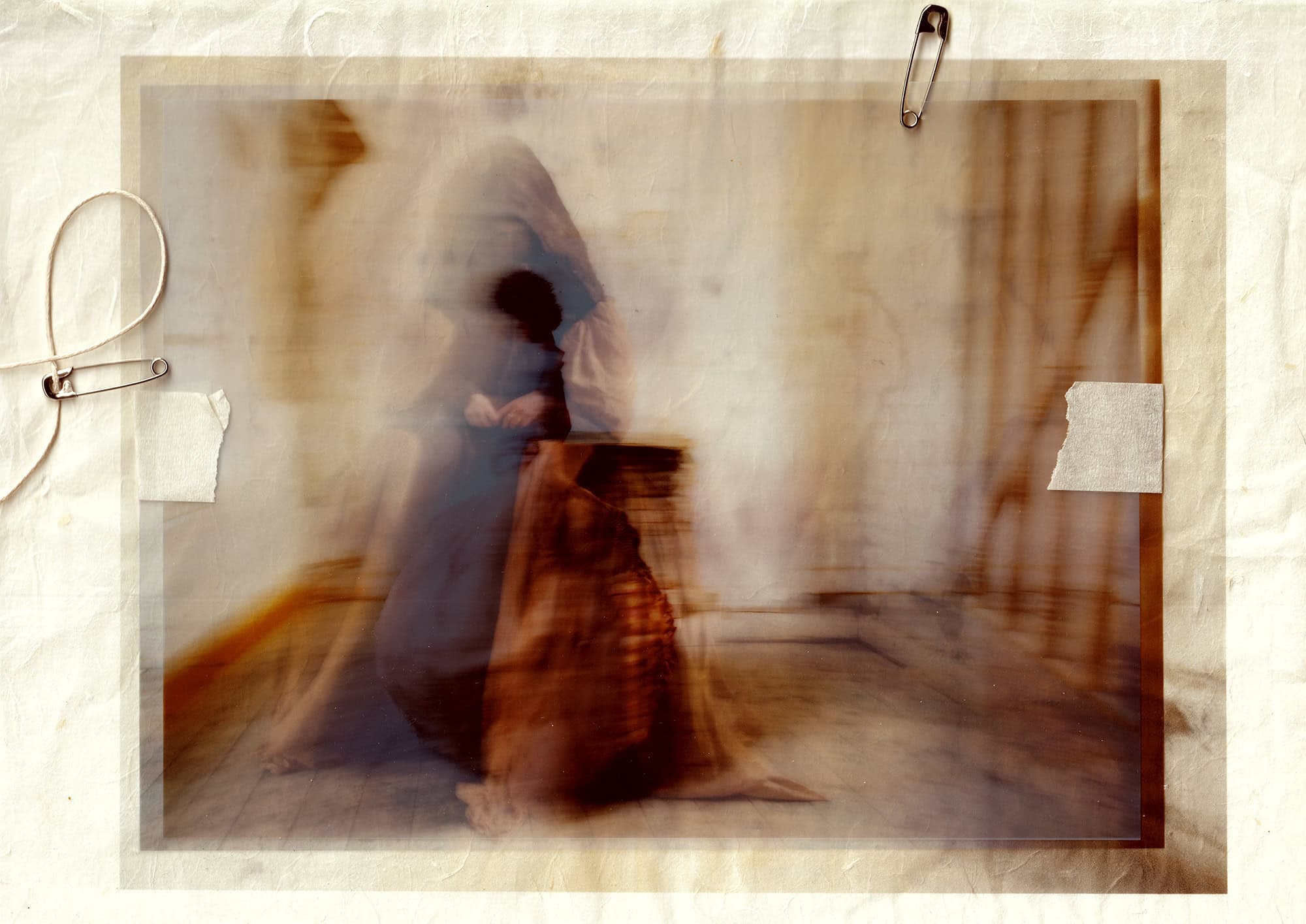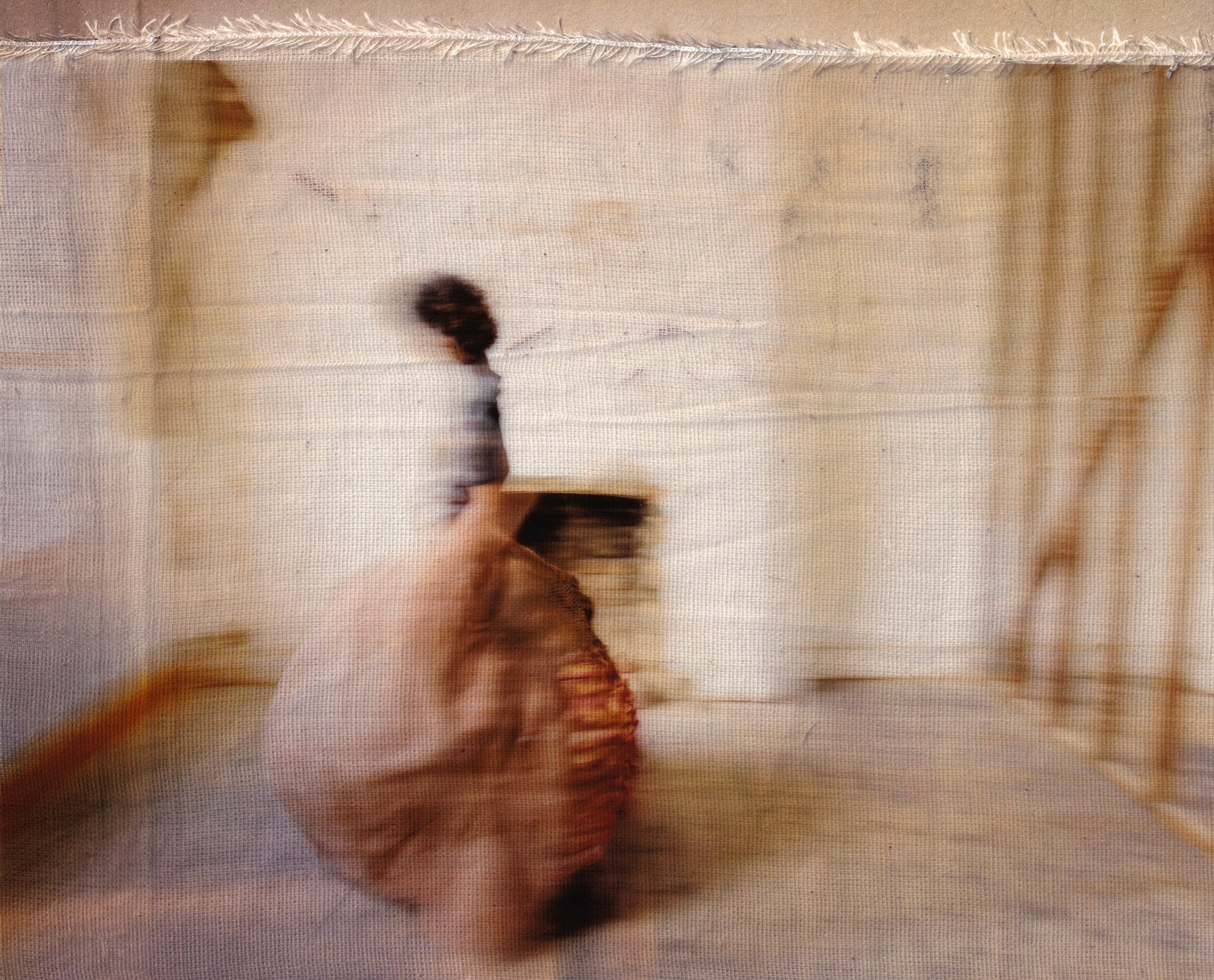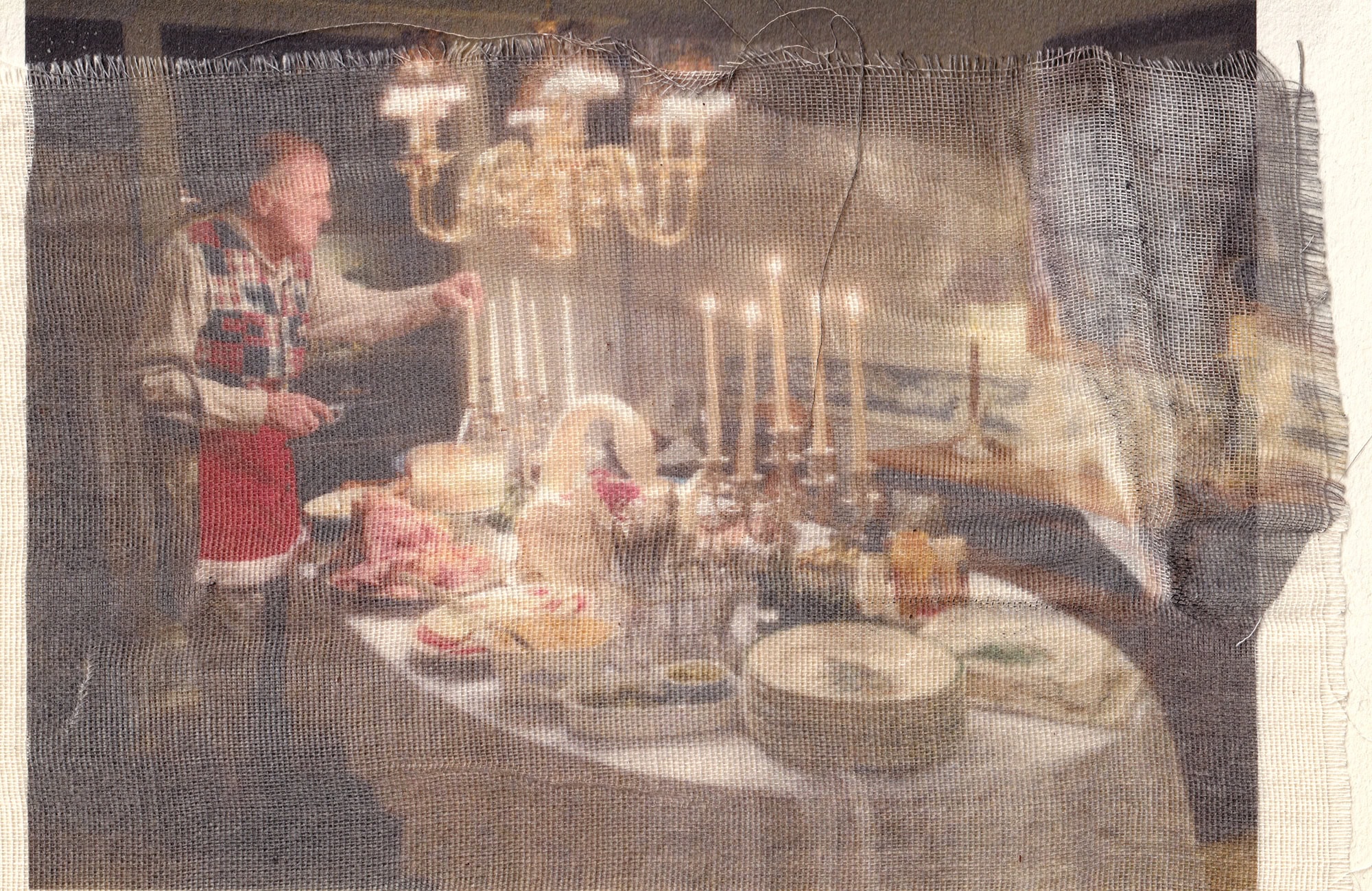 These images are repeatedly processed through cycles of printing and scanning, allowing them to accumulate visual residue in the same way memories gather distortion each time they are recalled. Many prints are transferred onto muslin adhered to cardstock before the fabric is peeled away, leaving a ghostlike impression behind. The muslin layer is then suspended slightly in front of the transfer print, producing a doubled image that appears fused from afar but separates upon closer inspection. Additional materials like mulberry paper, tracing paper, and transparency film, create translucent layers that resemble fading afterimages.
