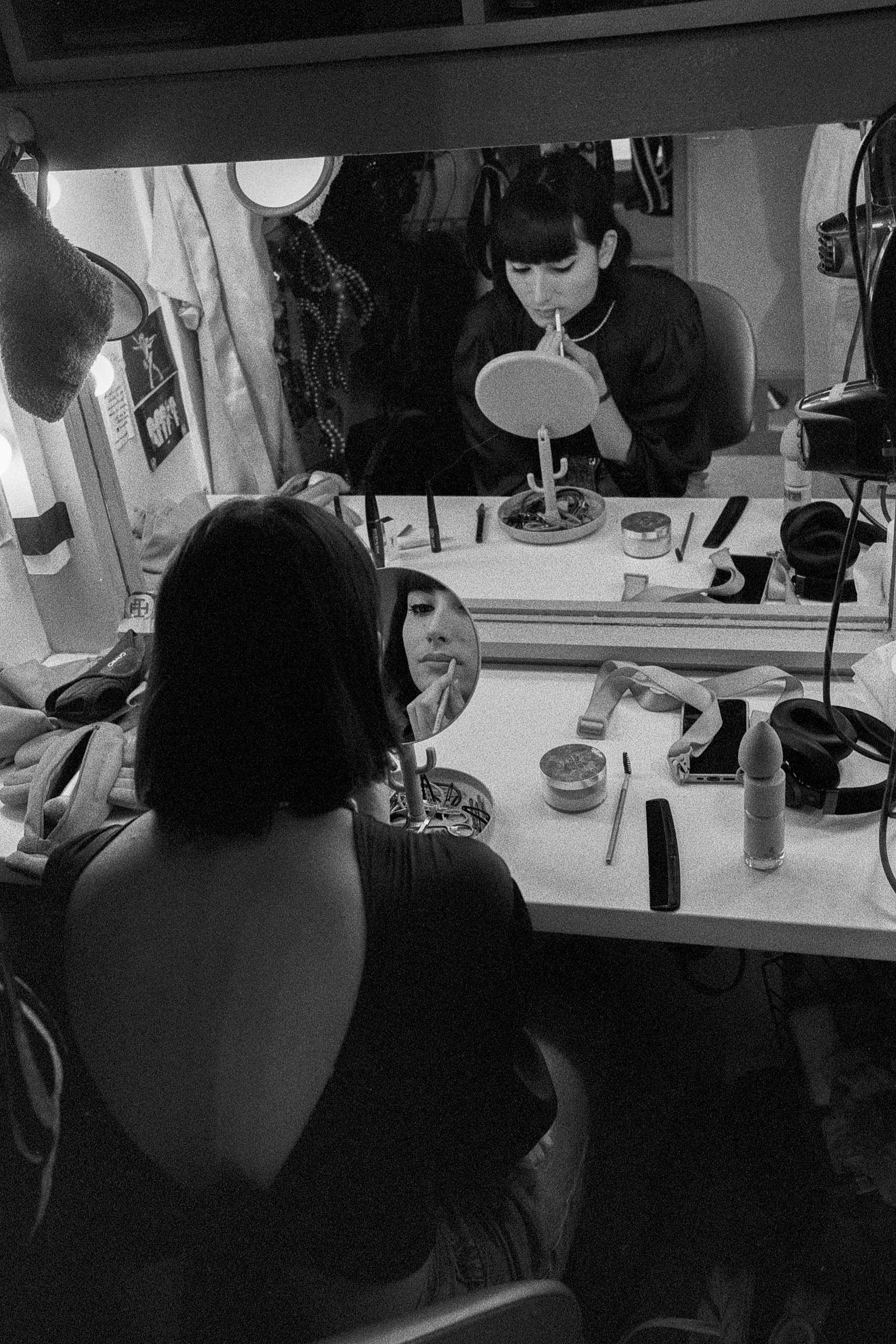 Behind the stage lights, the artist finds a fragile form of truth, made of fogged mirrors and smudged make-up. The camera becomes a subtle witness, more interested in the vibration of the skin than in the perfection of the pose.