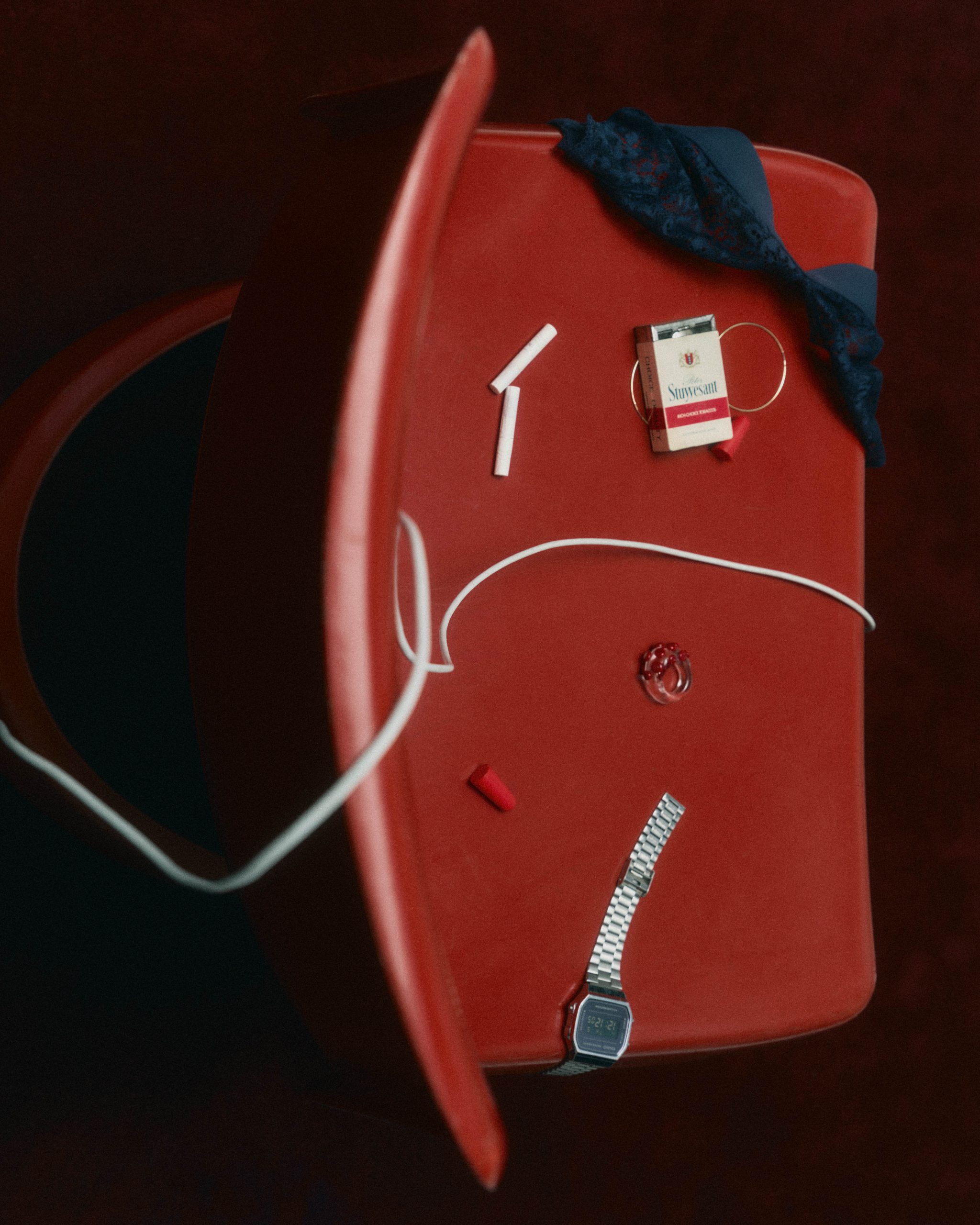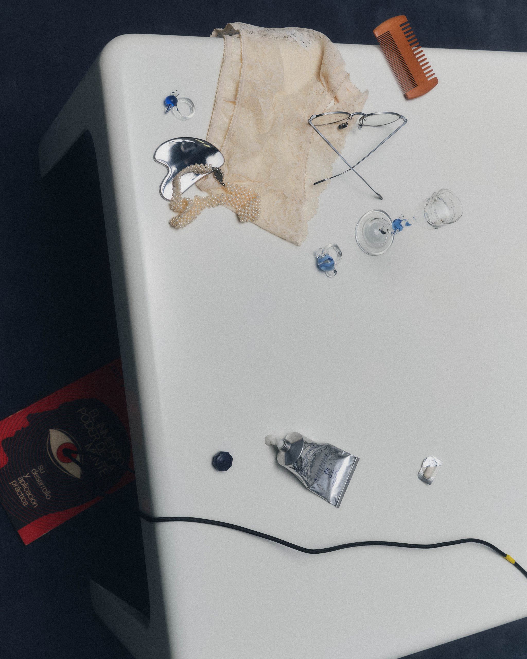 Each object carries a trace of its owner. A book left half-read suggests intention or distraction. A glass of water hints at routine. Receipts, jewelry, medication, or small personal items quietly map out patterns of behavior, what we value, what we neglect, what we return to without thinking. These are not grand statements of identity, but subtle clues, revealing contradictions and small obsessions that rarely surface in public.