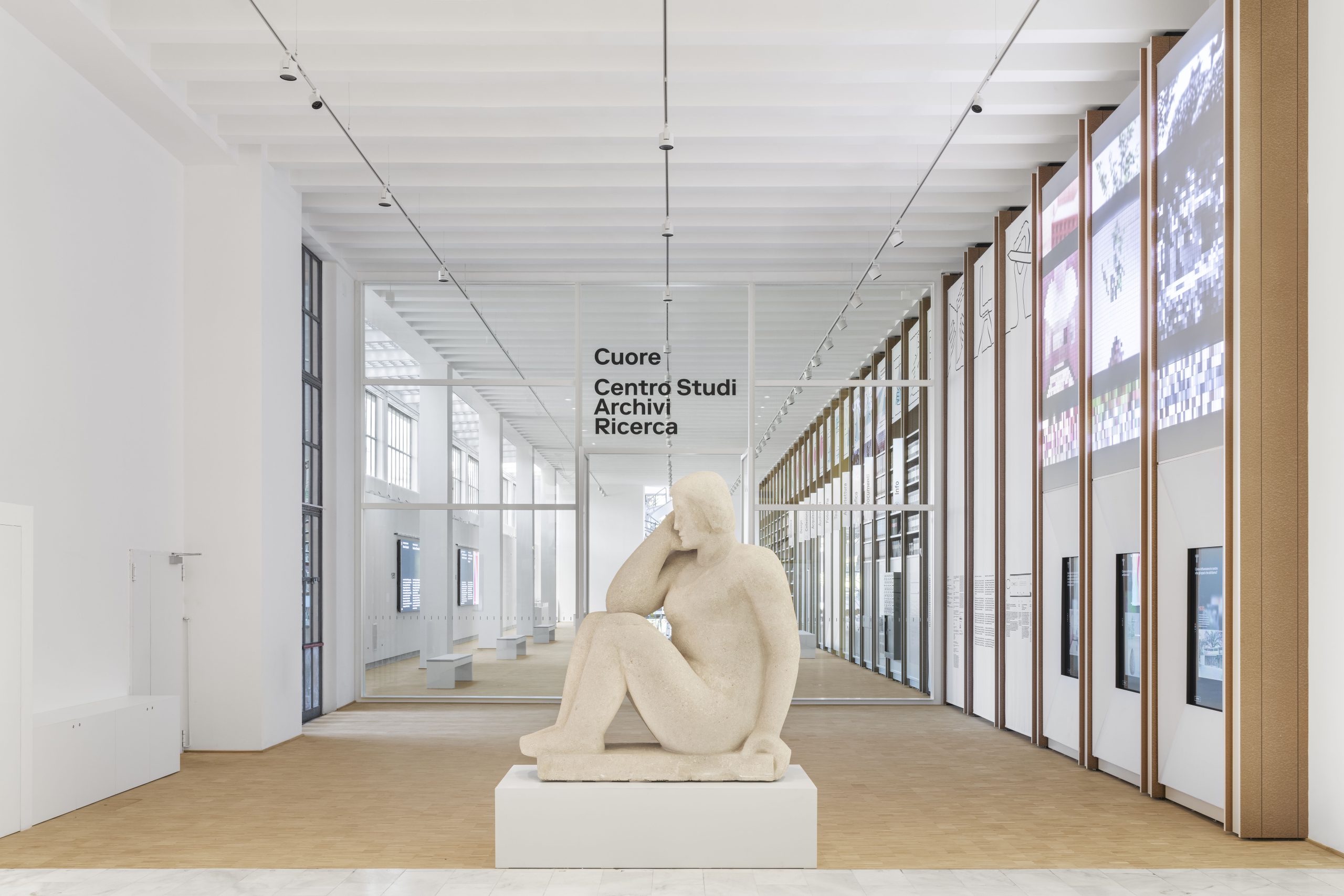 AR.CH.IT Luca Cipelletti developed the concept and the architectural and exhibition design of the space. The architectural project is part of a larger plan to enhance and restore the original design of the Palazzo dell’Arte developed by Giovanni Muzio in 1933 which Triennale is carrying out on the entire building. Cuore has been designed in such a way as to enhance the dialogue between architecture and exhibition, between content and container, creating an environment in which modular elements renew themselves over time.