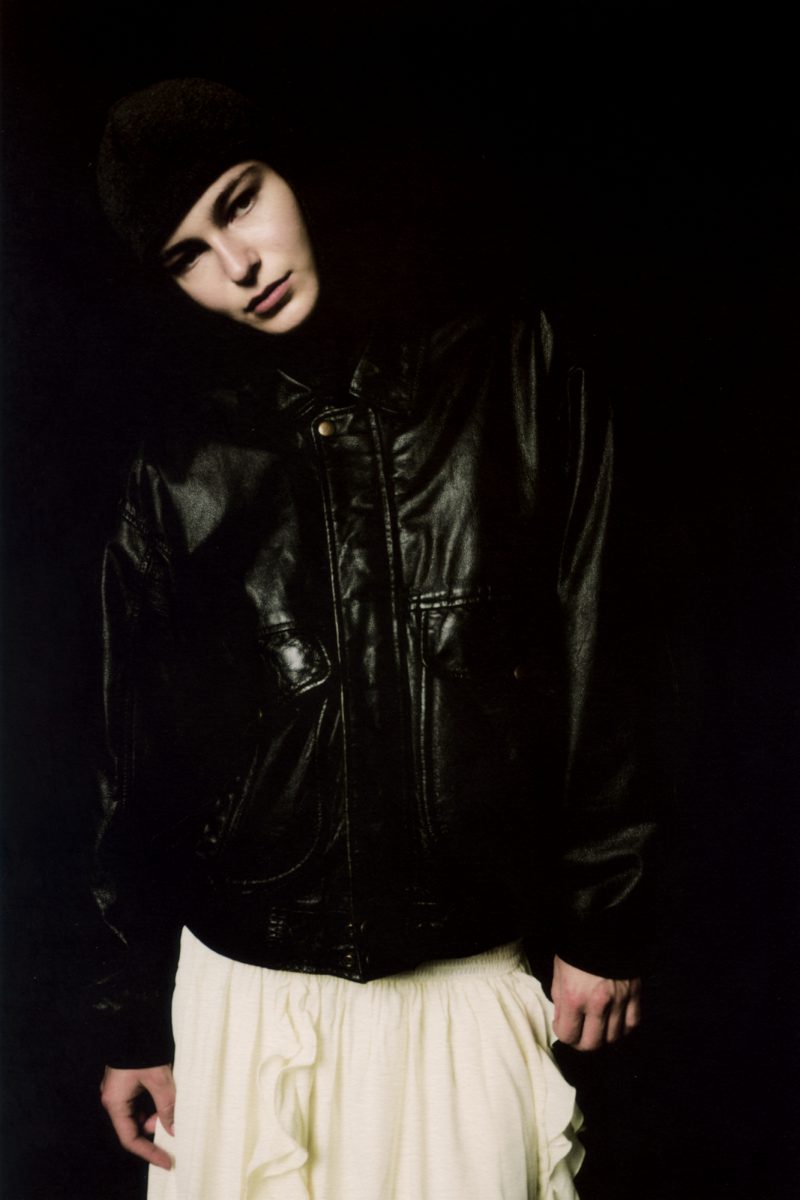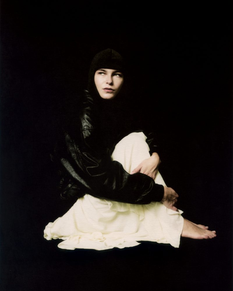 In today’s visual landscape, fashion is often subject to a certain kind of framing and precision, representing an anxiety to assert itself through movement. The editorial ‘January Blue’, created by photographer Tristan Bangle, is instead an exploration of stasis as a space for negotiating identity. In collaboration with stylist Sierra Young, Bangle transforms the language of dance into a series of psychological ‘still images’. The model, Audrey Hamre, occupies the space with a bodily awareness that reveals her dance training, even though every muscle appears intentionally contracted in an act of non-action. In one of the shots, Audrey wears a dark leather jacket over a white skirt, a material contrast that symbolises the duality of the project. Here, the face is partially covered by a balaclava, an element that abstracts the individual to emphasise the archetype, converting the body into a pure plastic form. The title “January Blue” refers not only to a colour palette – evident in the cerulean tights paired with faux fur – but also to a state of mind. It evokes the coldness of reflection, the moment of suspension before the gesture begins.
