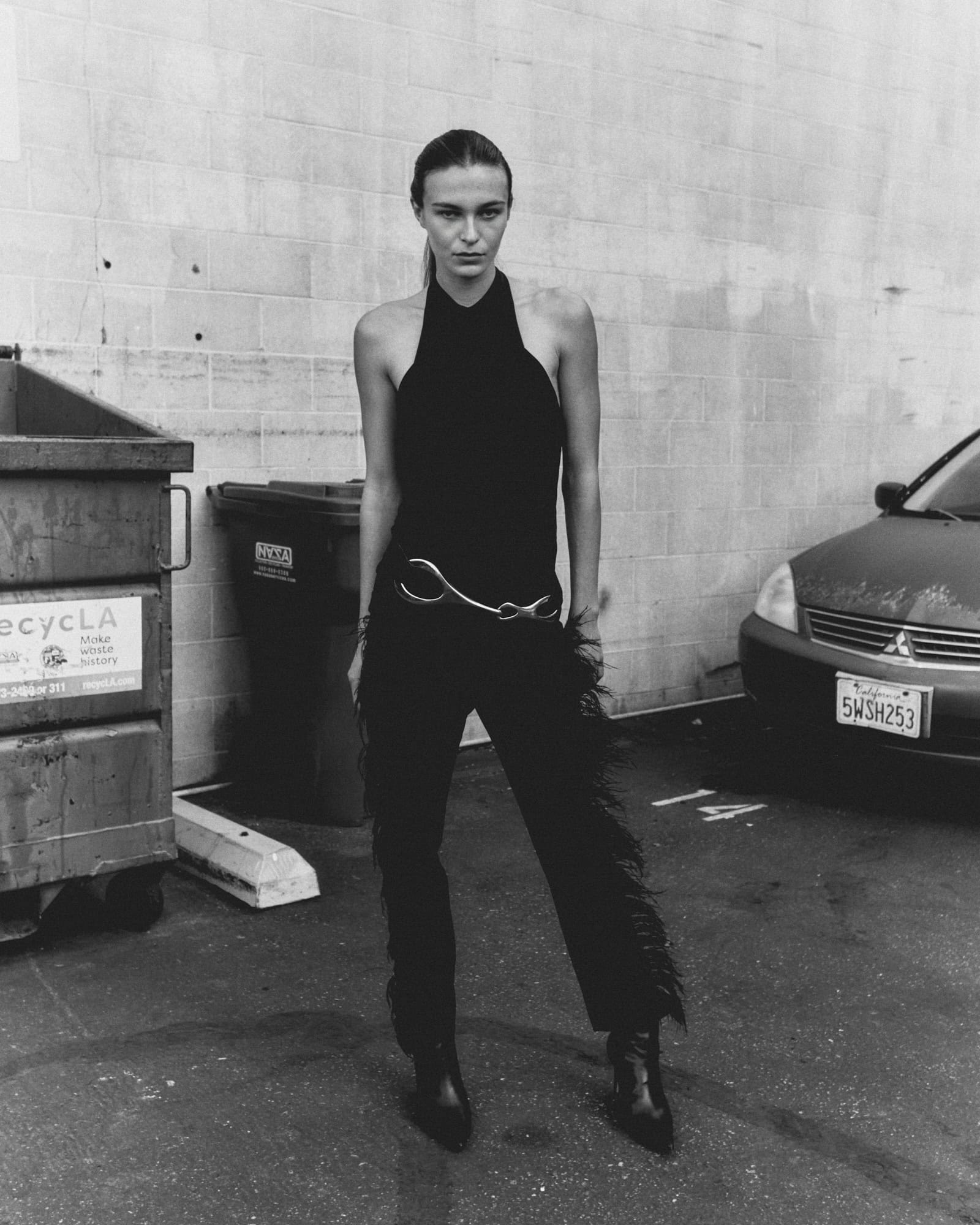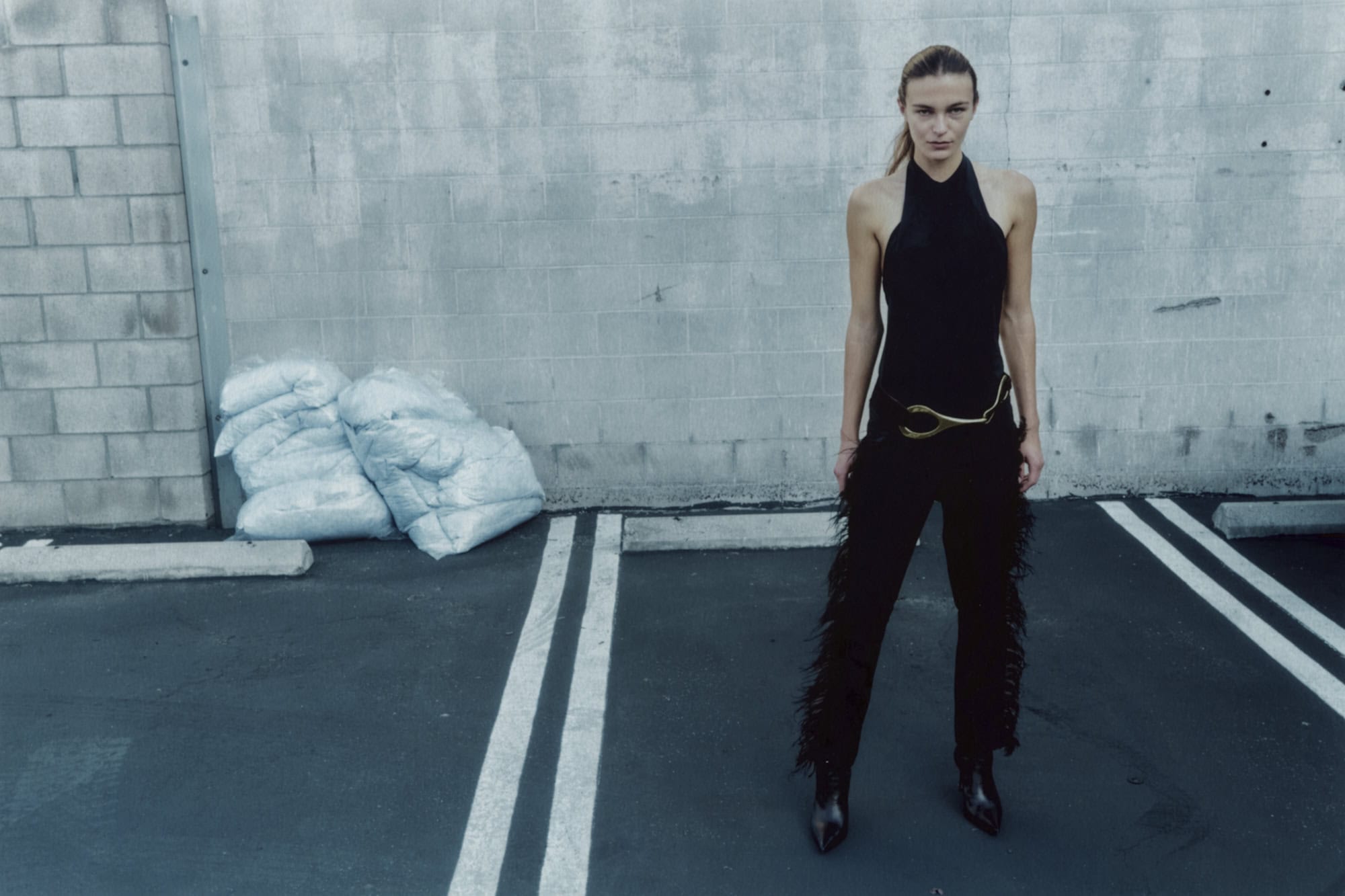 Bangle’s eye, supported by assistant Spencer Foltz, focuses on details that break the perfection of the pose. The outdoor shots, among industrial bags and empty car parks, stylishly remove her idealised patina to place her in a context of authentic desolation. The sheen of the leather contrasts with the softness of the feathers on the black trousers, creating a visual rhythm that compensates for the absence of physical movement. Audrey Hamre does not simply pose; she observes the void or faces the camera with a direct gaze into her inner self. ‘January Blue’ reminds us that sometimes the most meaningful act a body can perform is to remain motionless, waiting to understand who it will become once it resumes its journey.