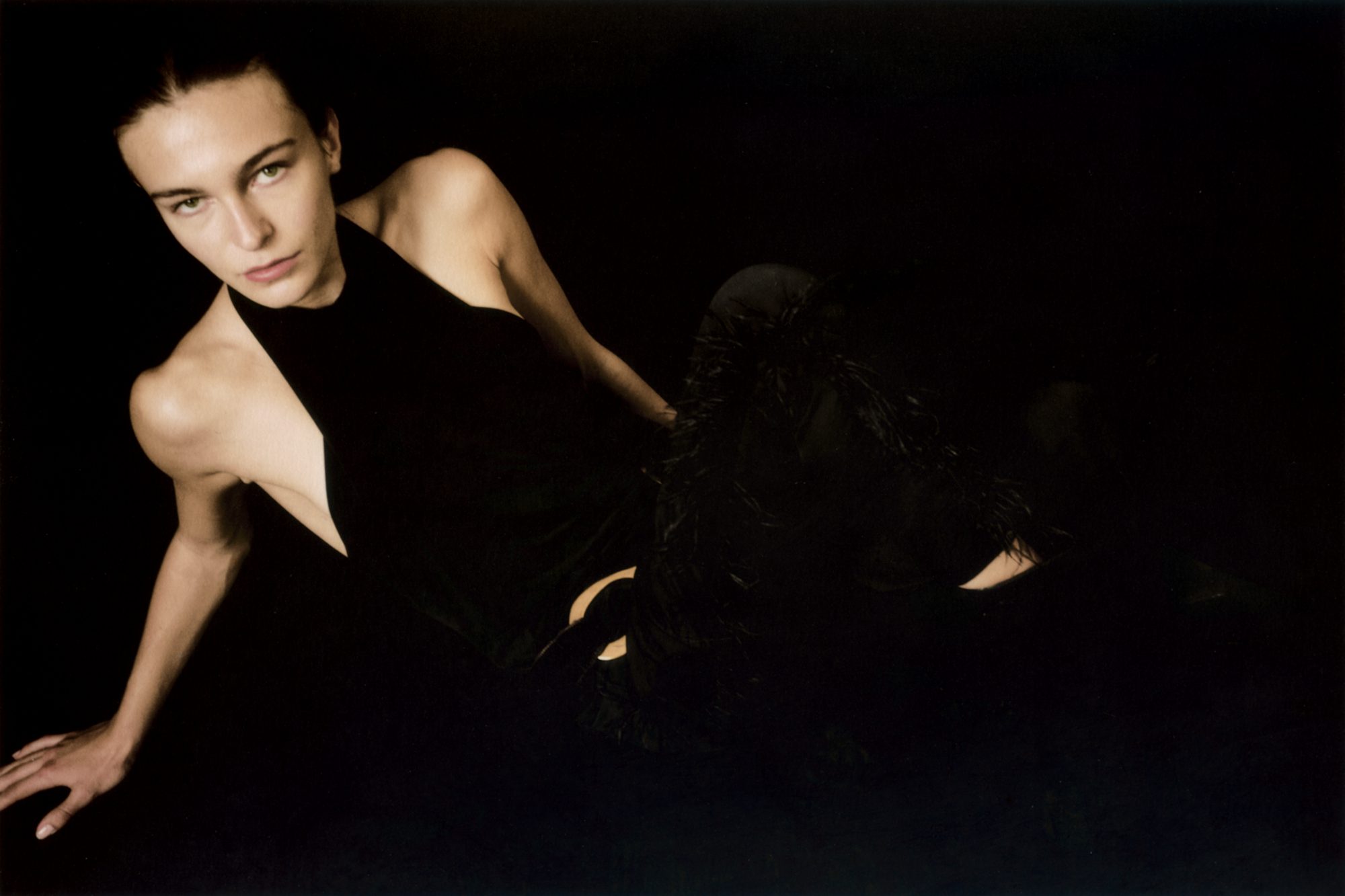 In today’s visual landscape, fashion is often subject to a certain kind of framing and precision, representing an anxiety to assert itself through movement. The editorial ‘January Blue’, created by photographer Tristan Bangle, is instead an exploration of stasis as a space for negotiating identity. In collaboration with stylist Sierra Young, Bangle transforms the language of dance into a series of psychological ‘still images’. The model, Audrey Hamre, occupies the space with a bodily awareness that reveals her dance training, even though every muscle appears intentionally contracted in an act of non-action. In one of the shots, Audrey wears a dark leather jacket over a white skirt, a material contrast that symbolises the duality of the project. Here, the face is partially covered by a balaclava, an element that abstracts the individual to emphasise the archetype, converting the body into a pure plastic form. The title “January Blue” refers not only to a colour palette – evident in the cerulean tights paired with faux fur – but also to a state of mind. It evokes the coldness of reflection, the moment of suspension before the gesture begins.