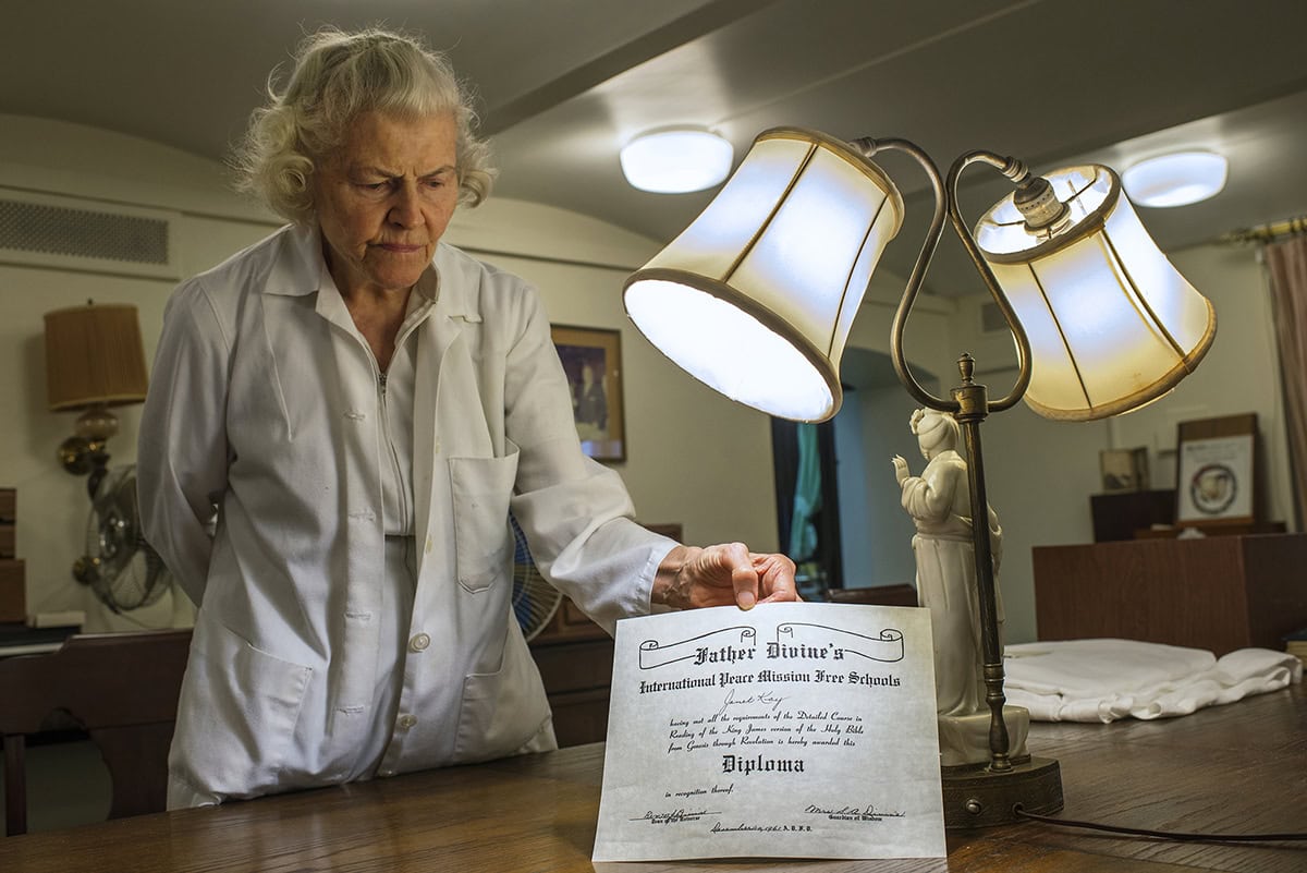 Father Divine, known to his followers as God, once had tens of thousands of devotees in 1930s Harlem. To the outside world Father Divine died in 1965, but for his followers he “lay his body down” and is still with them as he always has been. Now in their seventies, eighties, and nineties, eighteen of the remaining celibate followers live with Mother Divine at Father’s estate outside of Philadelphia. In 2013, I spent five weeks living with and photographing this community.