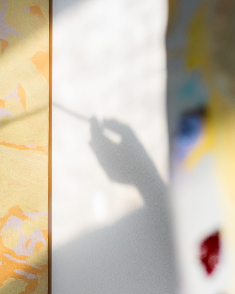 The images in this series seem like fragments of an interrupted conversation, where the body is never a static object, but an extension of the creative act. We see this in the detail of a hand holding a brush, captured at the exact moment between decision and intuition; or again, in the play of shadows that projects the outline of a body onto a sea-green wall, suggesting that the artist’s identity is inseparable from the space she inhabits.