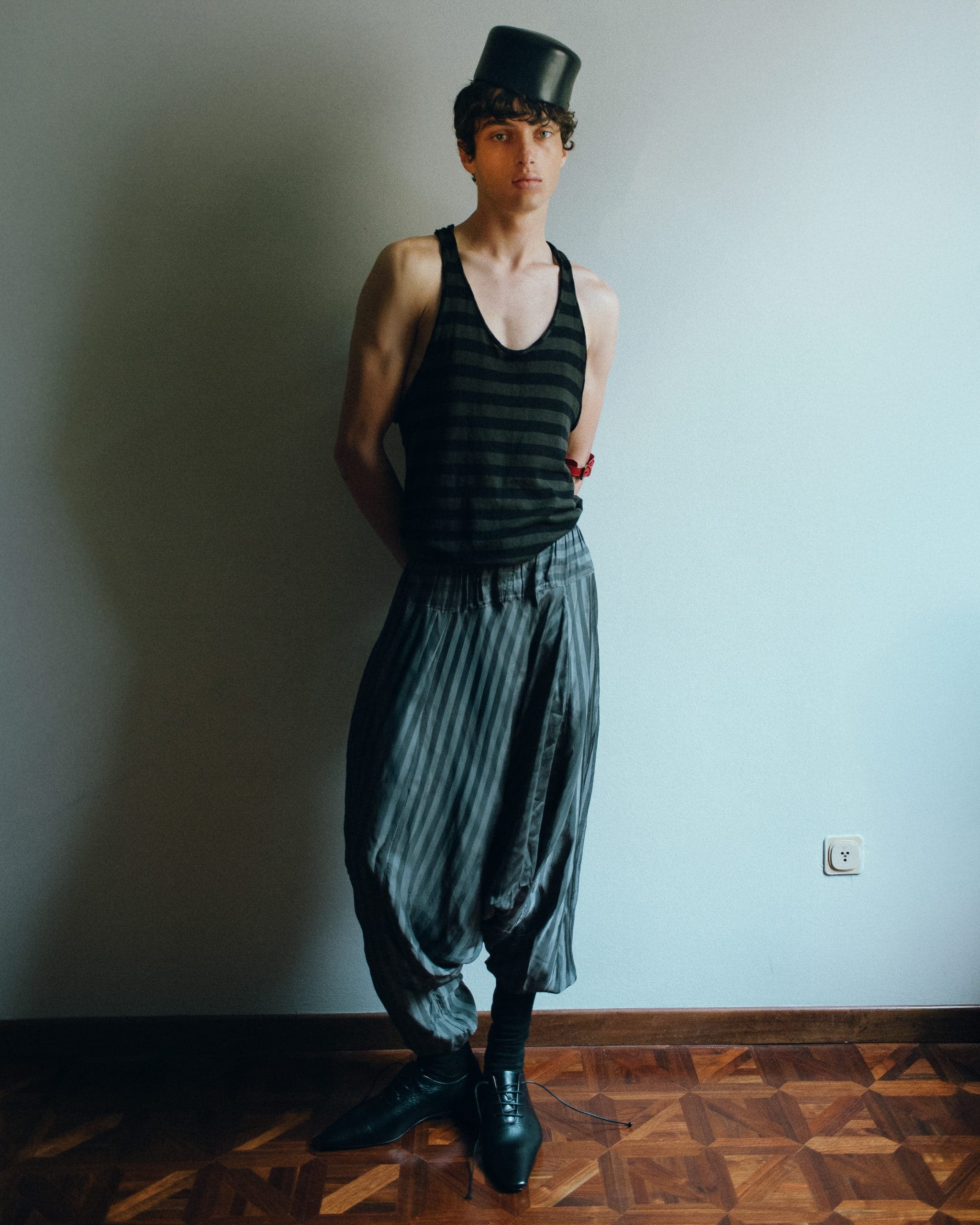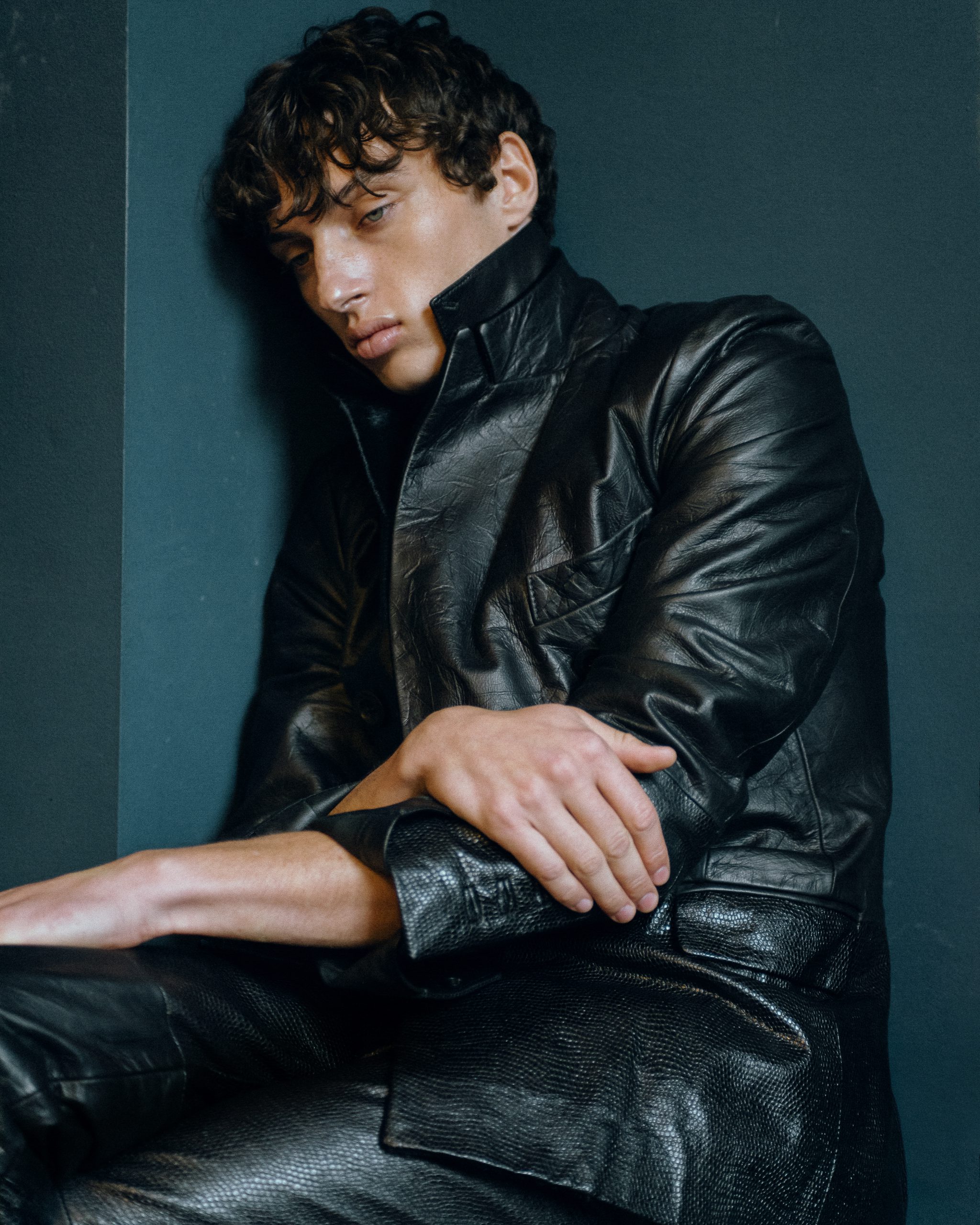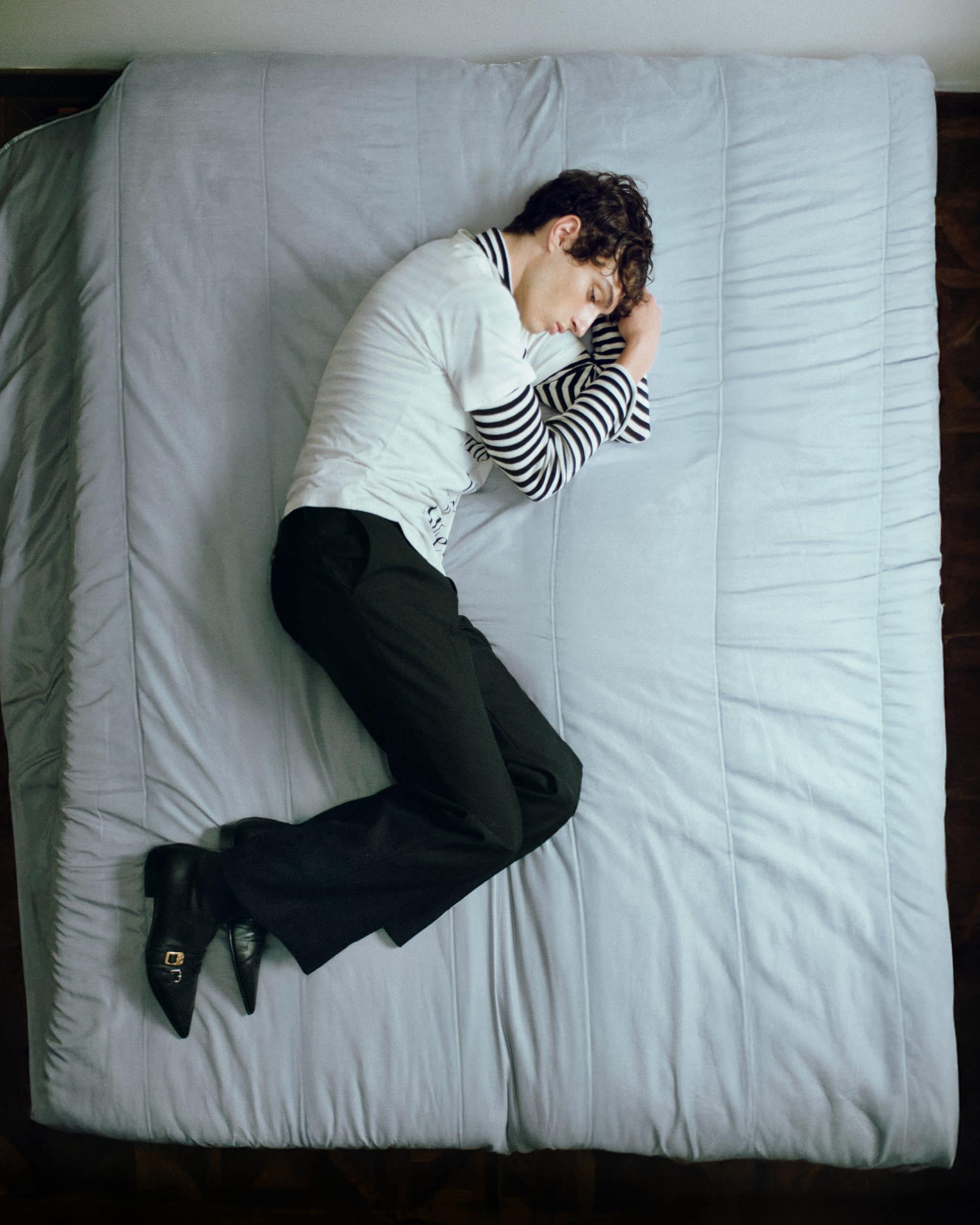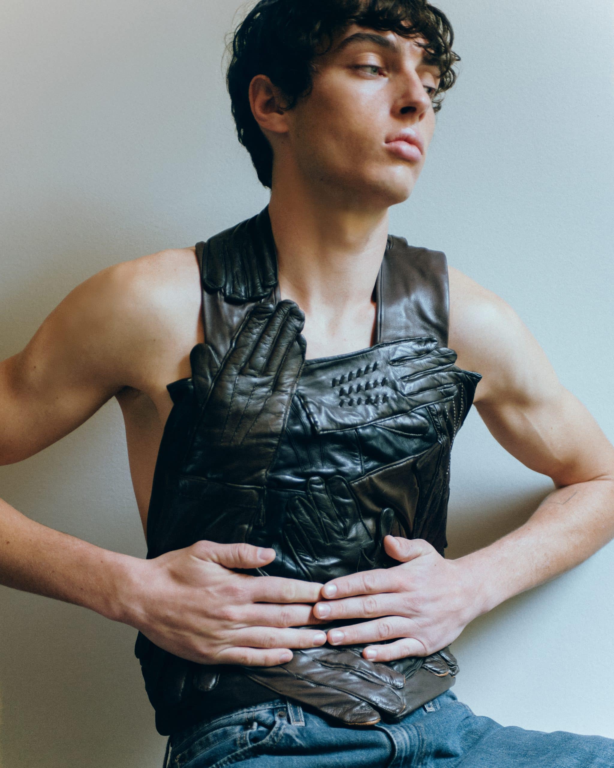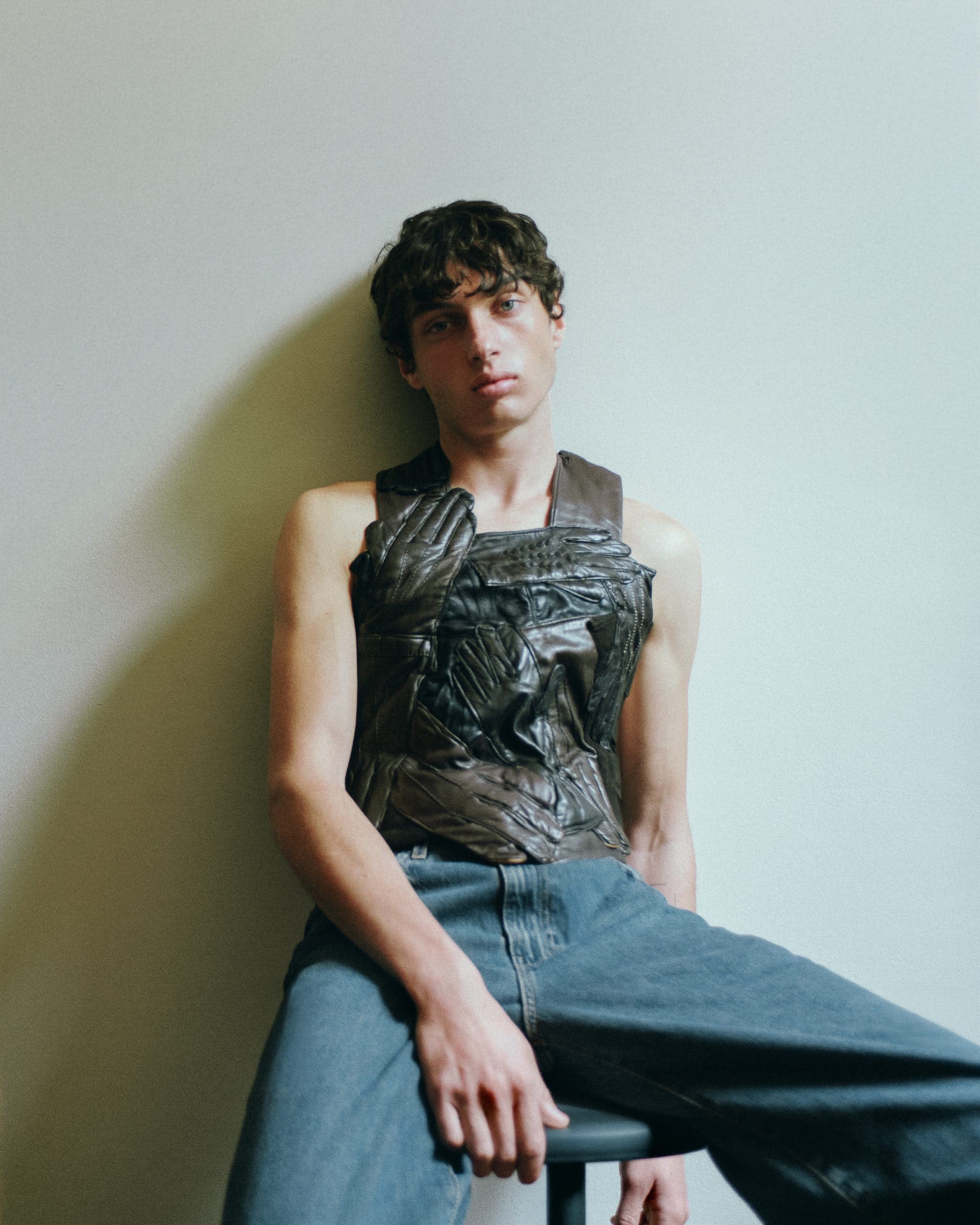 The styling follows the same logic: restrained, tactile, and deeply personal. Archival and contemporary pieces merge without emphasis, worn as extensions of mood rather than statements. An archival Maison Margiela Artisanal 2001 leather glove top appears like a second skin — protective, intimate, unresolved. Around it, garments from Céline, Bottega Veneta, Ferragamo, Valentino, and Antonio Marras move with a sense of lived elegance, never demanding attention.