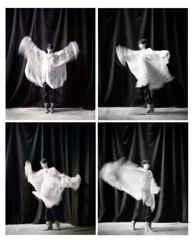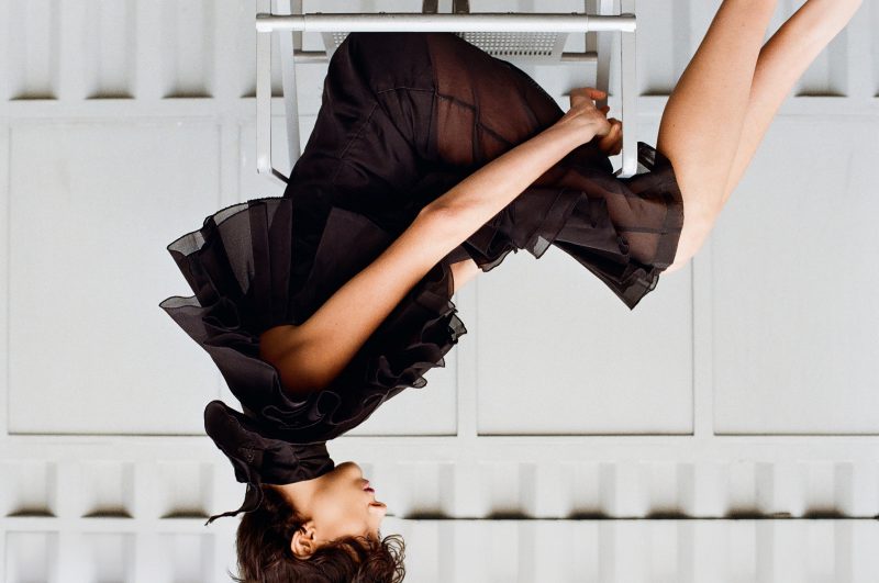 Movement takes on a primary role. The poses are broad and theatrical, with arms spreading like wings, sudden twists, suspended or inverted bodies. In a black and white sequence, movement is multiplied in a grid of images, suggesting an attempt by the body to transcend the boundaries of the frame. Performance and dance are explicitly evoked, but also photography as a tool for decomposing time. The warehouse, a space designed for accumulation and order, is thus pervaded by a destabilising energy.
