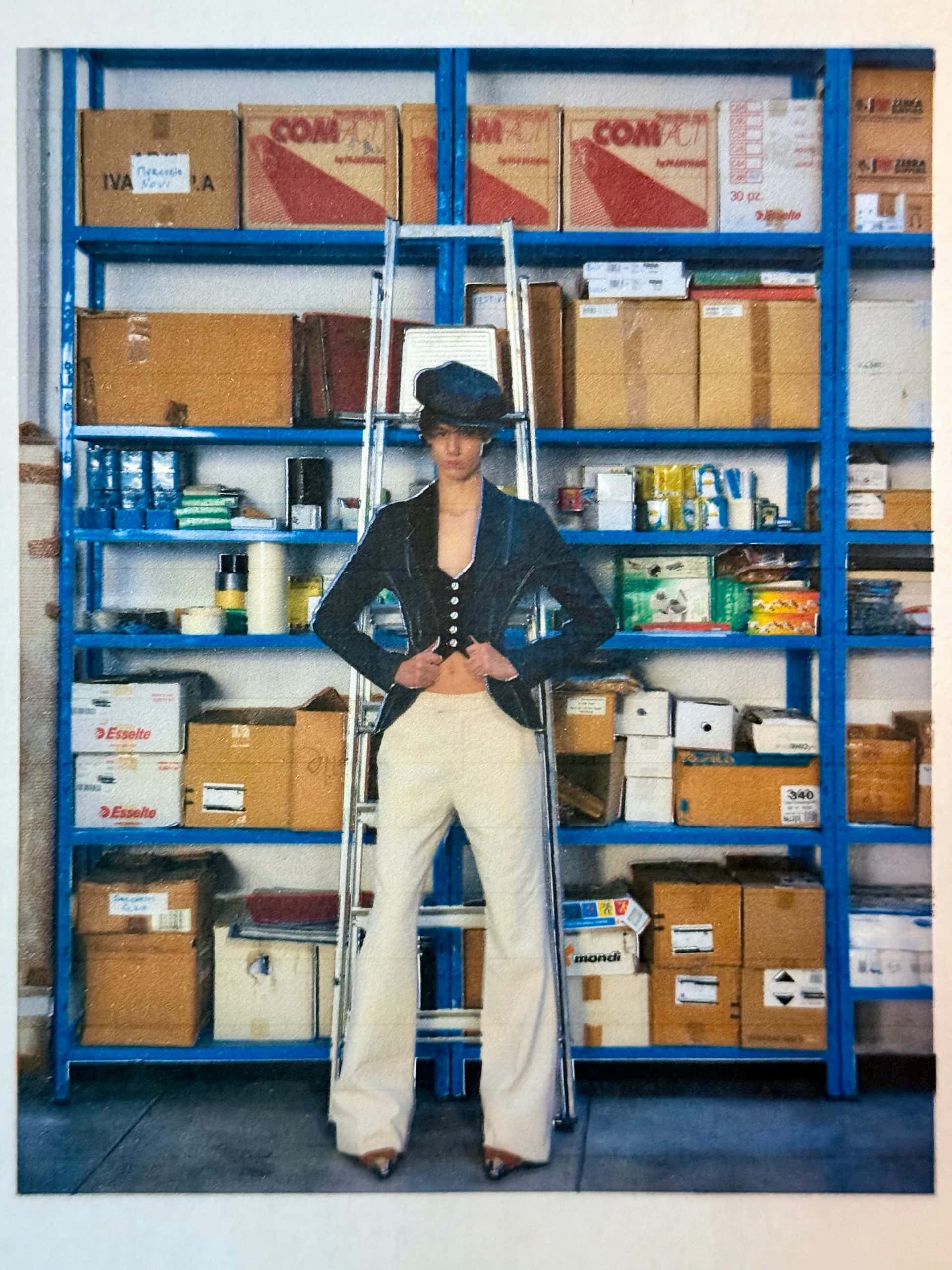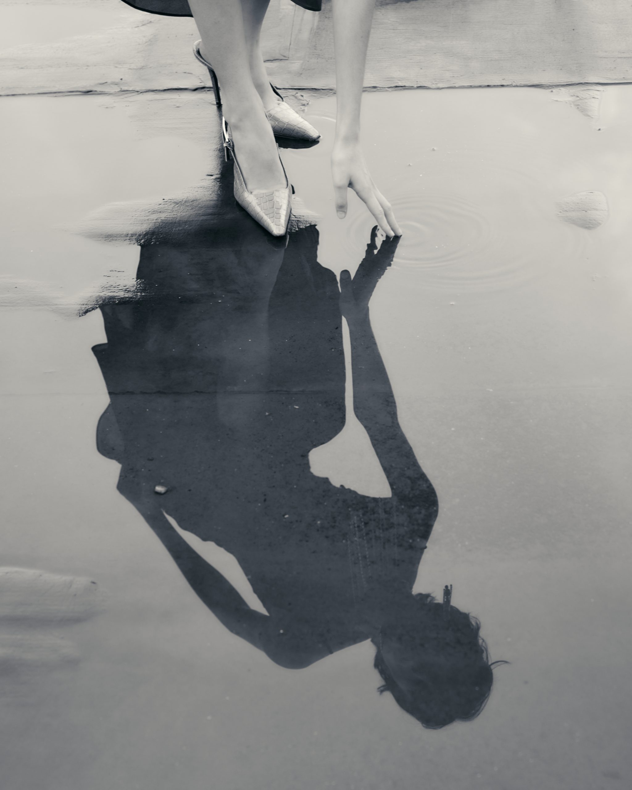 Magazzino is like a dialogue between power and space, between body and architecture. The images develop a narrative that unfolds within a functional and austere environment, namely a warehouse, elevating it to a new level of aesthetic grammar. Femininity is performative, manifesting a condition of resilience. Bianca Cedrone’s photography works through subtraction. Industrial surfaces, damp floors, shelves full of packaging and metal containers are transformed into neutral backgrounds, without becoming passive. In some compositions, the model’s body is reflected in puddles, duplicating itself and creating a fragile and unstable mirror image that suggests a femininity in constant flux, not bound to a definitive posture. The reflection is not only optical but also conceptual, as elegance manifests itself as an element in constant motion and recomposition.
