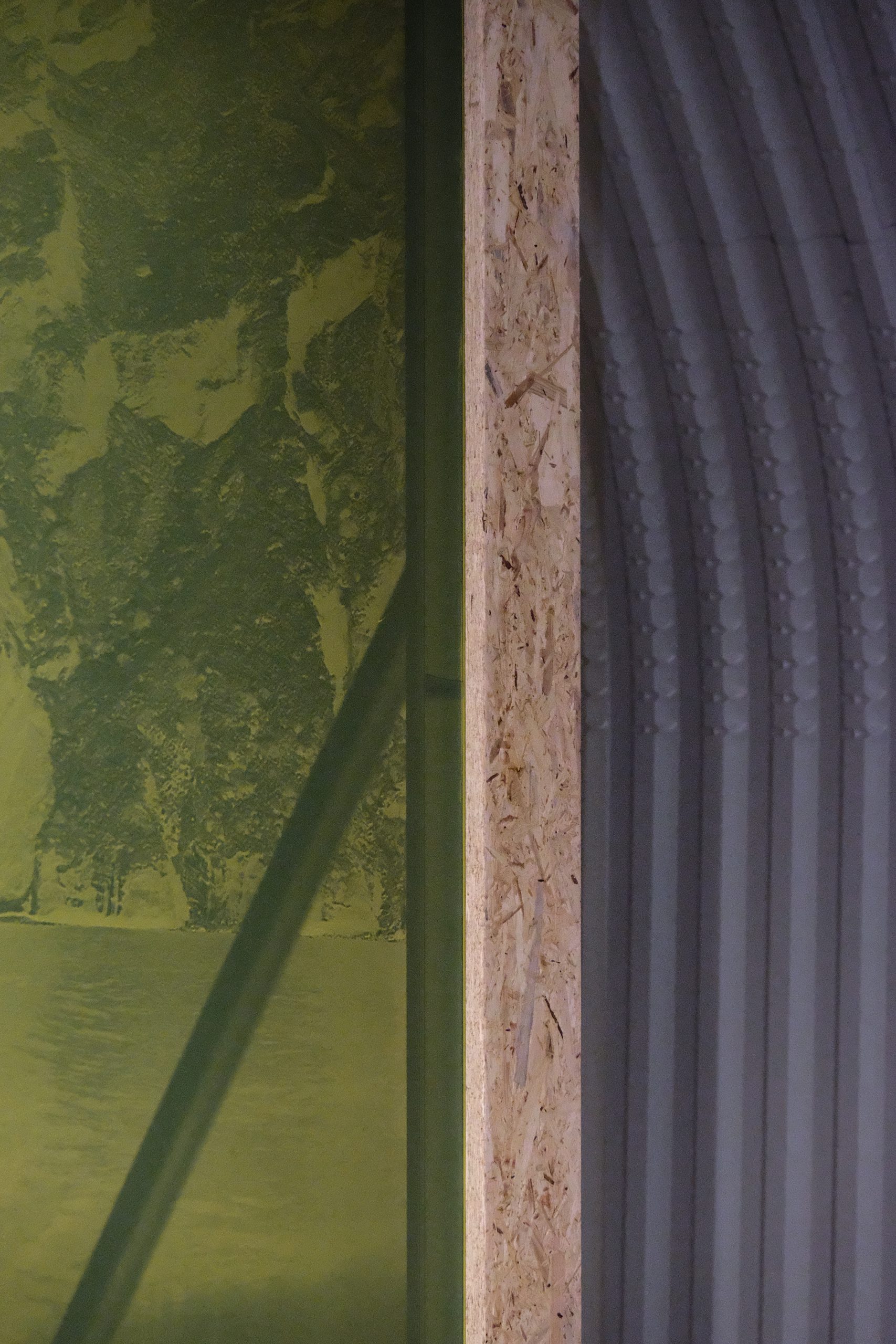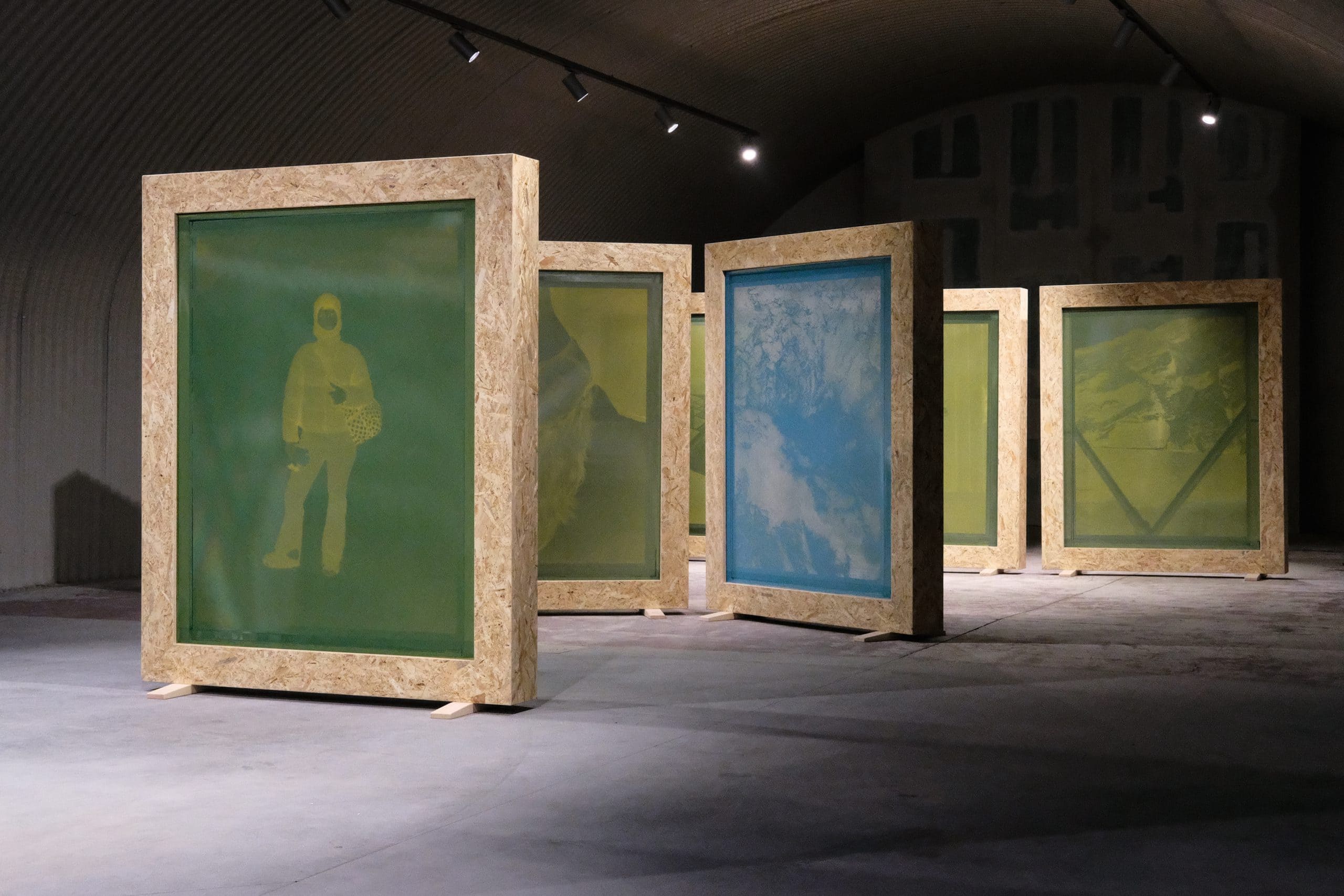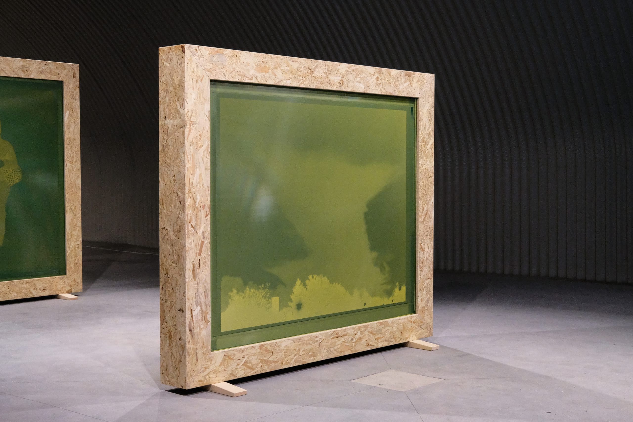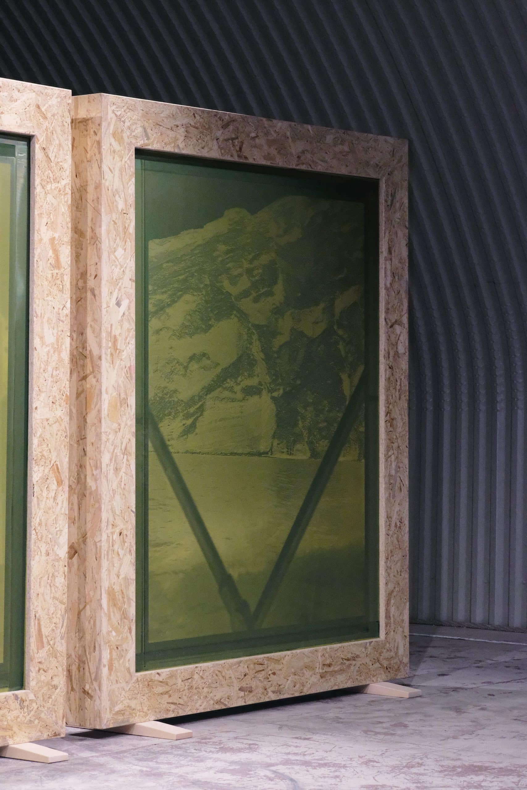 As a multidisciplinary practice, OLDER’s work spans various genres, from organic uniforms to furniture design. Now, for the first time in their own name, the co-founders venture into the realm of exhibitions, debuting with their inaugural show. The exhibition Memory Curtains exists at the intersection of photography, painting, and architecture. Each of the eight pieces exhibited originates as a photograph, which is digitised, transferred onto fabric and stretched over large-scale iron frames. The motifs, drawn from analogue photographs taken by Thuesen over the past decade, depict naturalistic and urban scenes devoid of specific locations. Exhibited for the first time as constructed artefacts, these images are encased in monolithic wooden crates, traditionally used for transporting artworks, and paired with static light installations designed to filter light through the structures. By juxtaposing these diverse, seemingly unrelated photographic subjects on framed screens, the exhibition evokes an isolated, imaginary architecture.