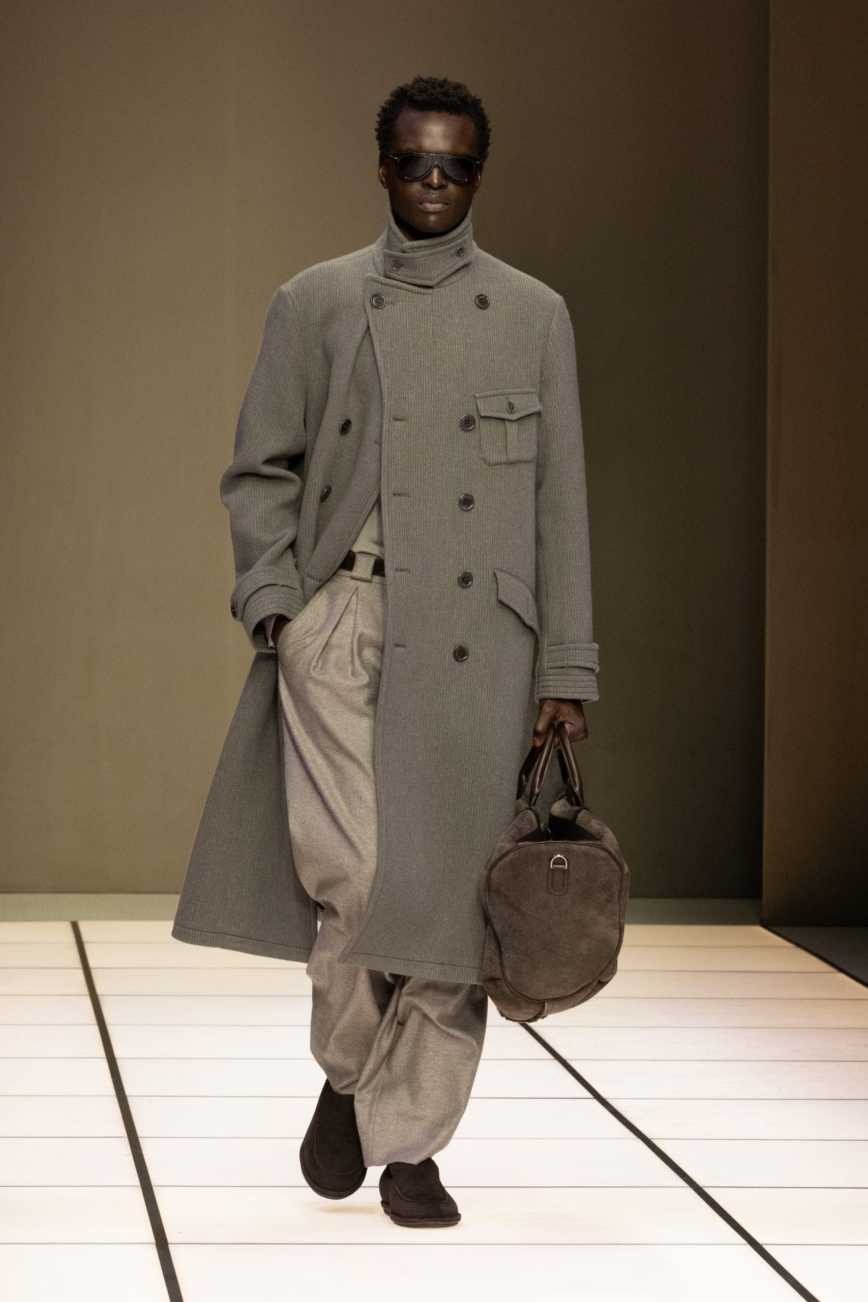 Color, long treated at Armani as a whisper rather than a statement, emerged with new confidence: olive green, amethyst violet, lapis blue igniting a base of greys, beiges, and deep navy. The effect was not loud, but alive. Fabrics did much of the talking — velvet, crêpe, ciniglia, silk — playing with light in ways that rewarded attention rather than demanding it. There was a quiet pleasure in the deception of surfaces: shearling that felt like velvet, silk that masqueraded as denim. Things were rarely what they first appeared to be.