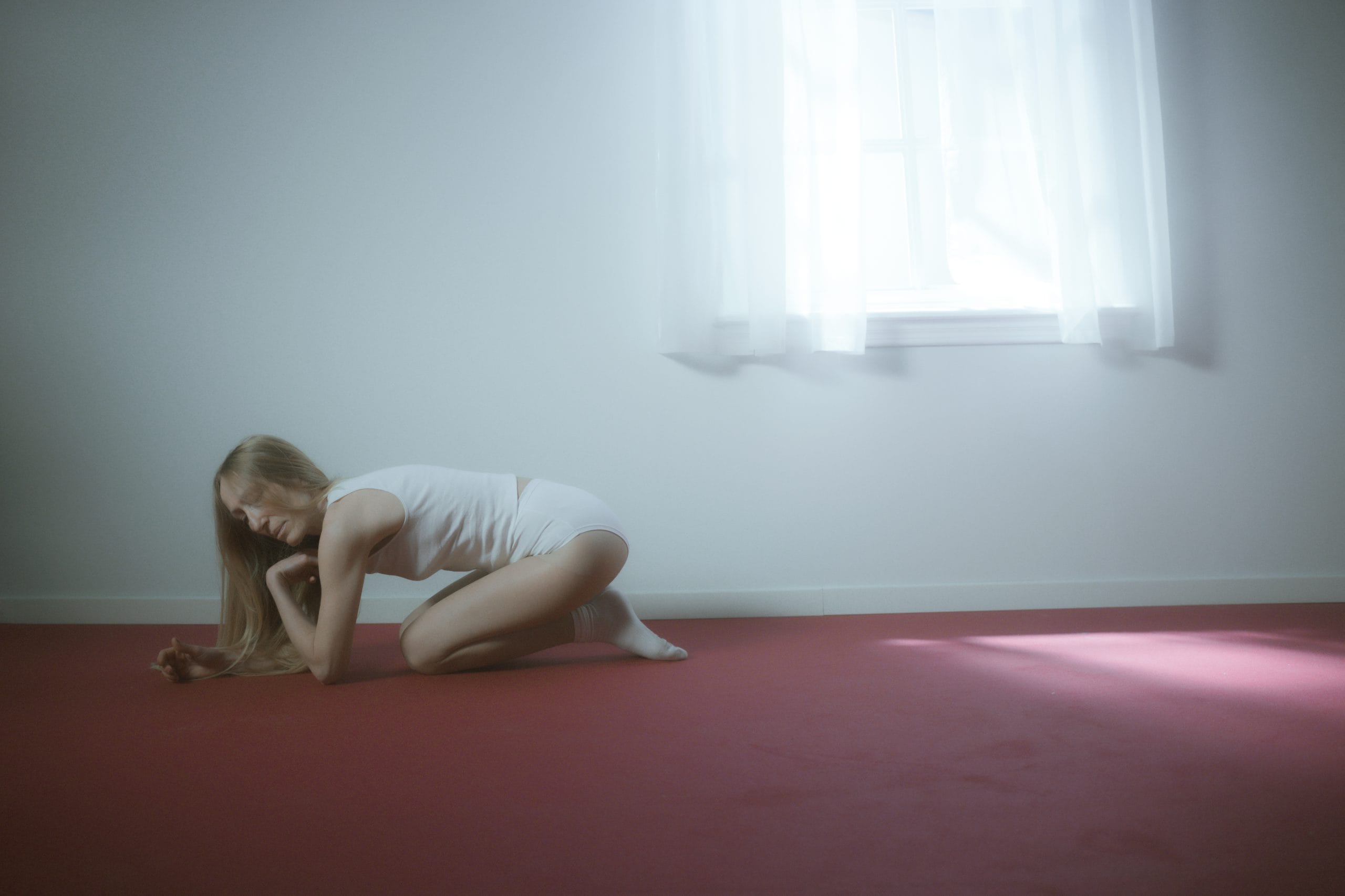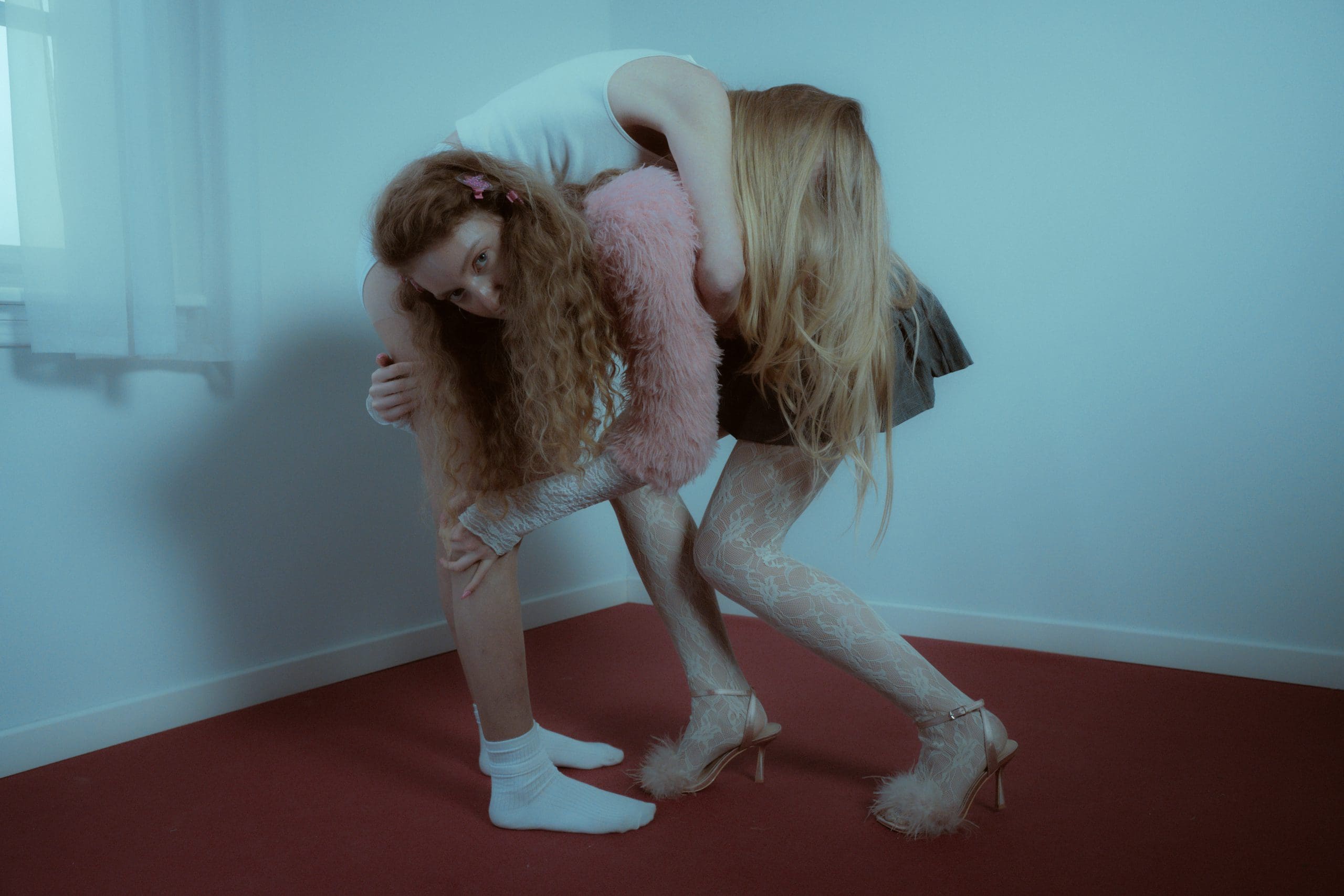 The setting refrains from domestic warmth to become a container. The room, with its sterile walls and diffused light filtering through a veiled window, is more reminiscent of a dressing room than a home. It is where transformation takes place, a mental space where identity is stripped away and clothed in new awareness. In this setting, the concept of the “double” emerges strongly through the constant presence of two female figures. They are not distinct