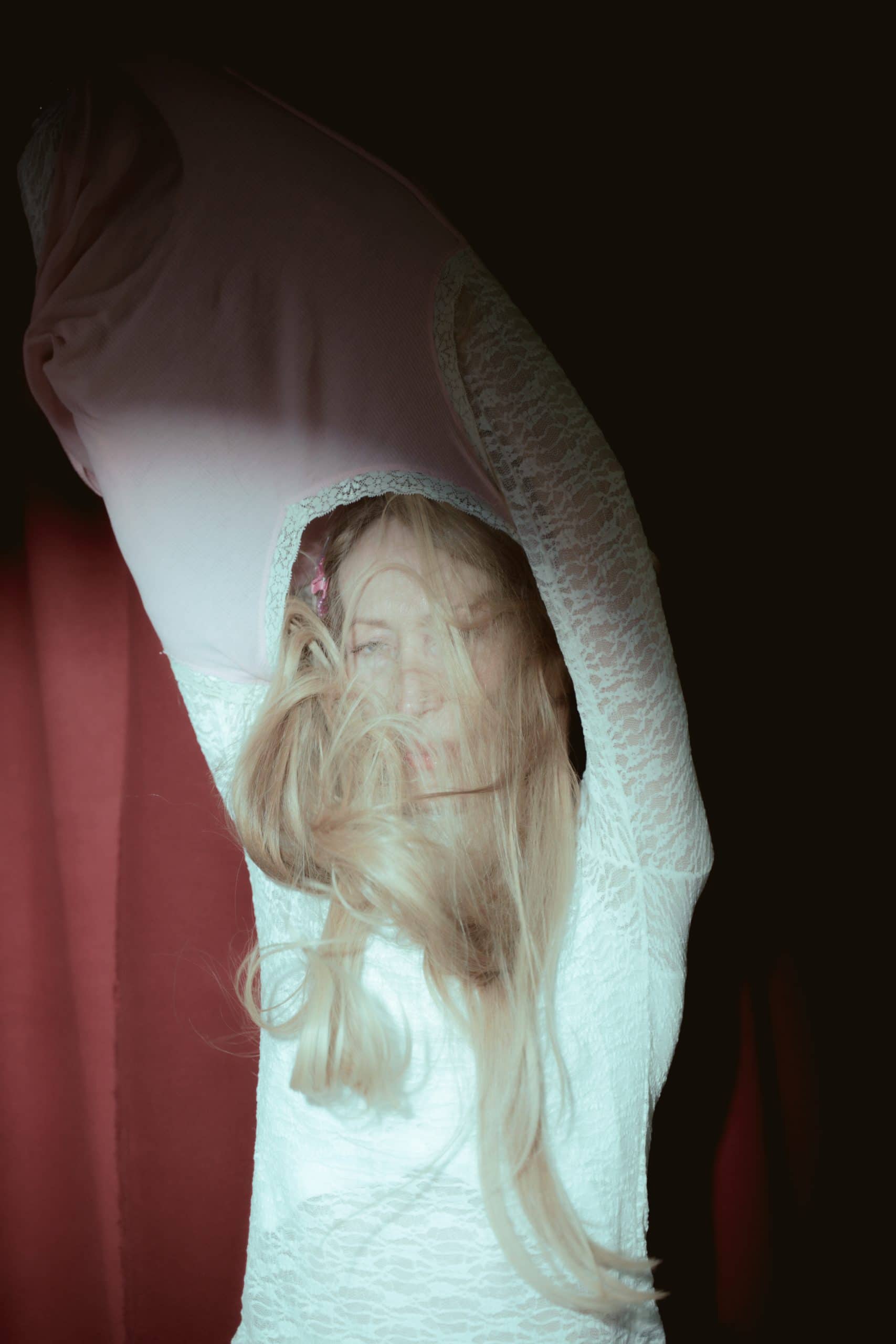 entities, but projections of different states of the same identity that coexist in unresolved tension. The visual narrative is divided into three acts that follow the liturgical path. Adoration, where the reflection does not show the present image, but the icon of a younger self, an inner image full of nostalgia and regret. Visually, this version appears magnified, almost disproportionate, a luminous and intense figure that seems to want to “swallow up” the adult woman who observes her in silence. Communion, where contemplation becomes action. The protagonist attempts an impossible fusion, trying to wear her past like a second skin. The union is only touched upon, revealing the insurmountable boundary between what we are and what we wish to return to being. Confession is the curtain closing on an inner theatre. Through the gesture of undressing, the protagonist abandons the idealised images in which she sought to inhabit. Vulnerability becomes the only possible form of liberation.