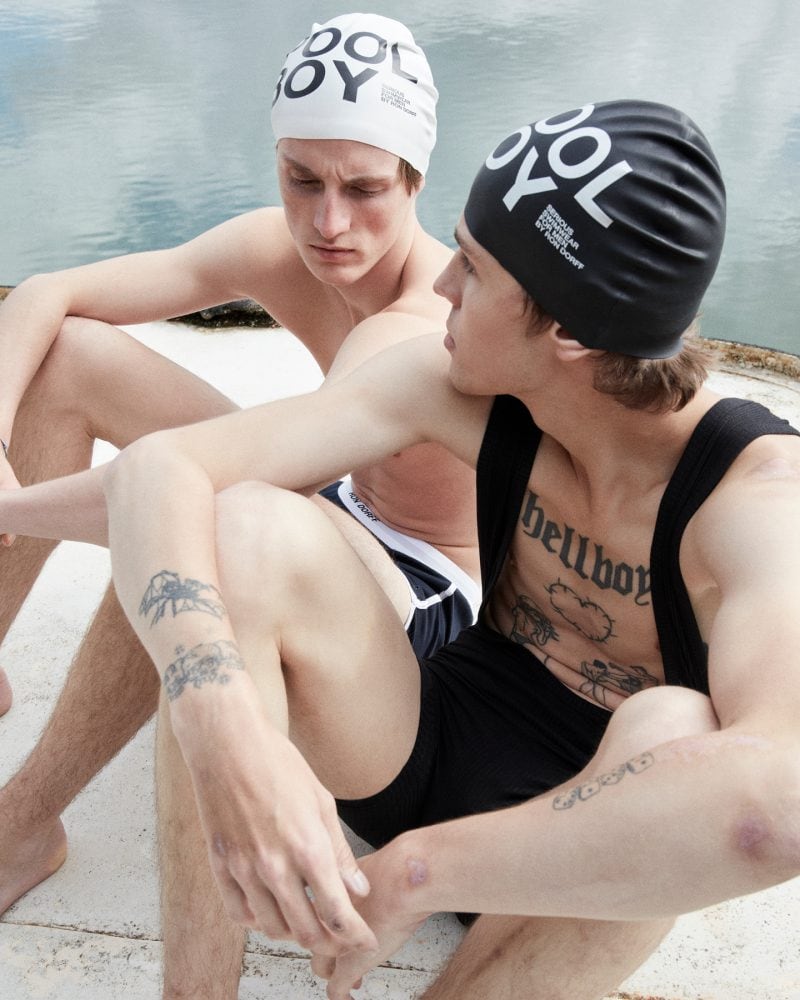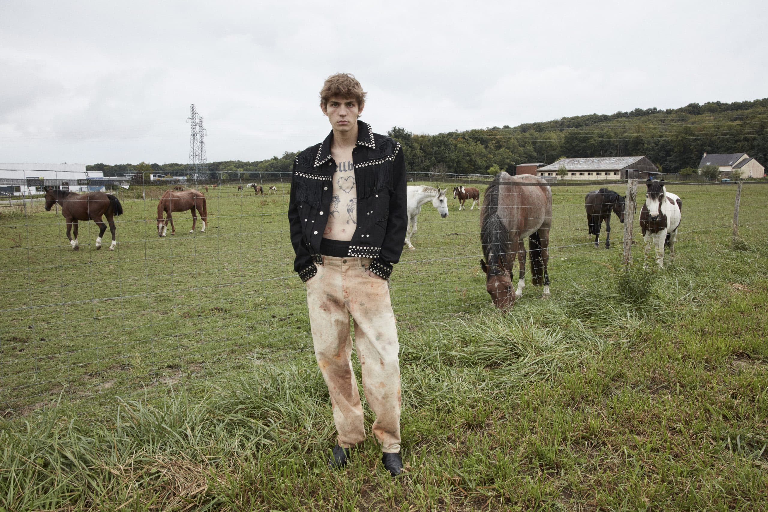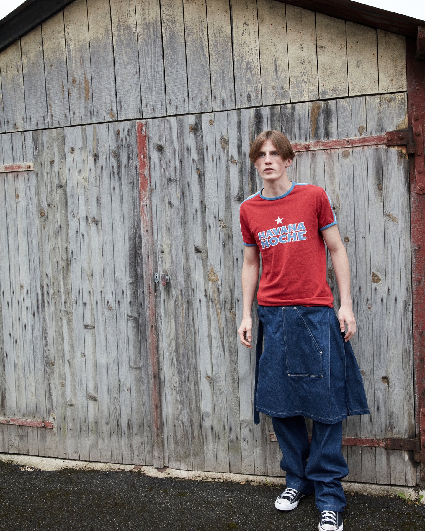 Evan wears a faded red t-shirt over a denim apron, and an imperfect, almost childish tattoo peeks out from beneath the fabric. The editorial refers to adolescence, a transitional period where the body becomes the main tool for exploration and self-discovery.
