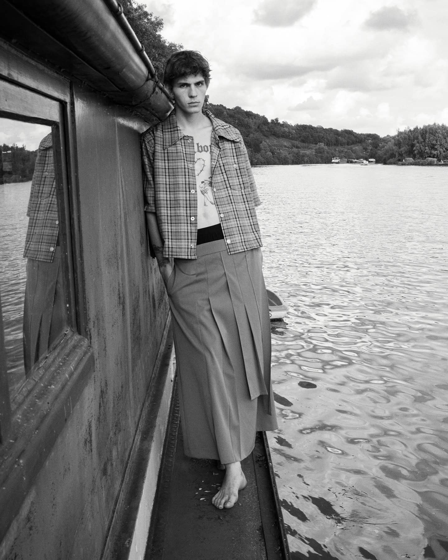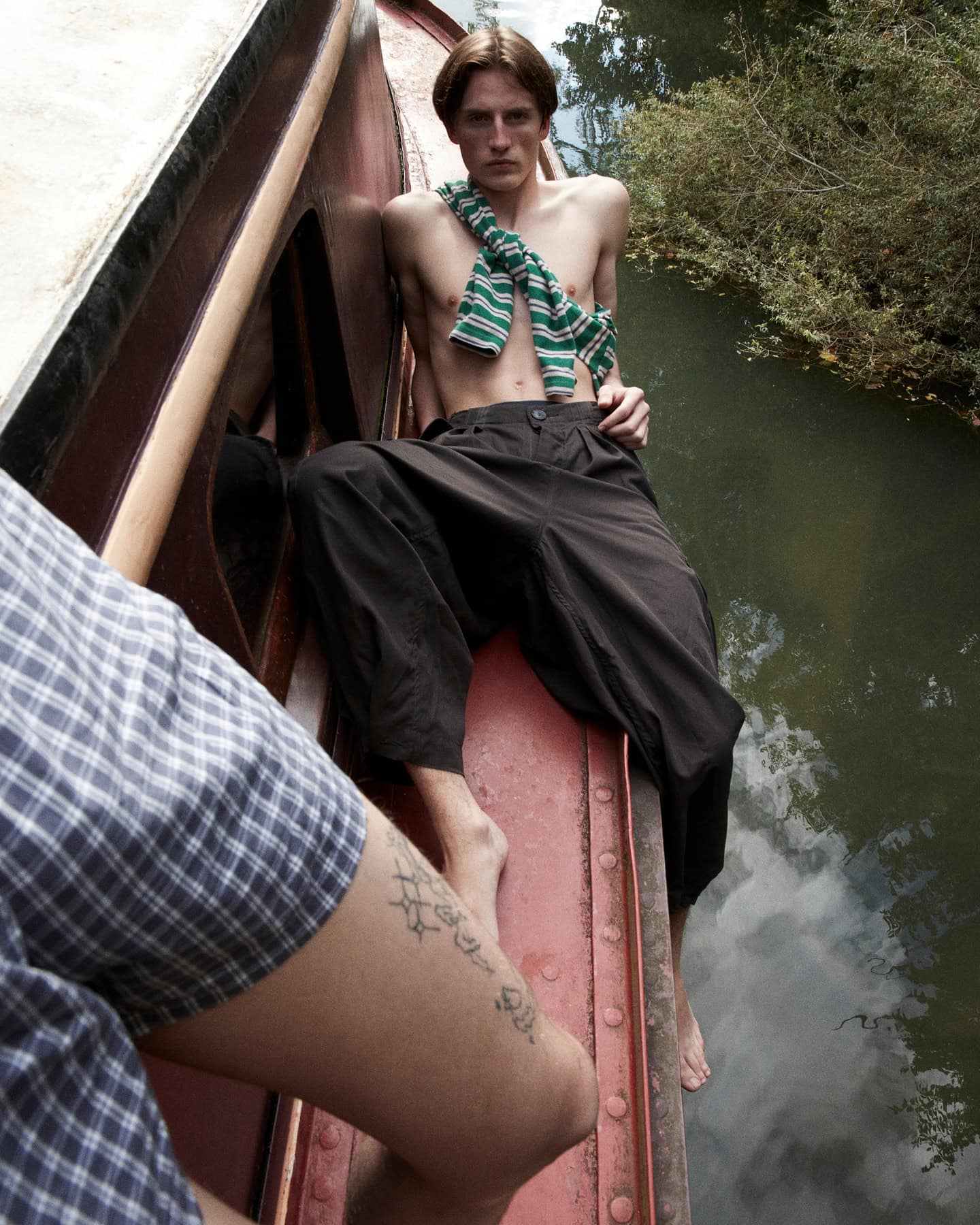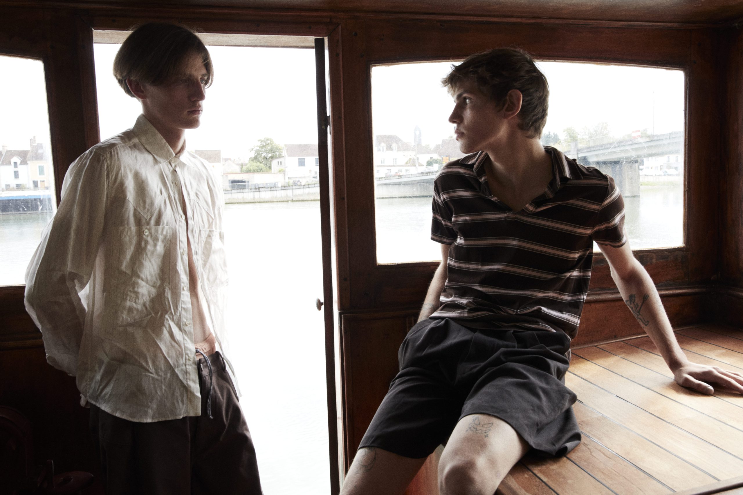 Along the banks of the Seine, Evan and Aleks, two young men, perhaps friends or perhaps something more, spend an afternoon aboard a boat. The images by Rose Guiheux, styled by Roxane Noel, capture a temporary stasis.