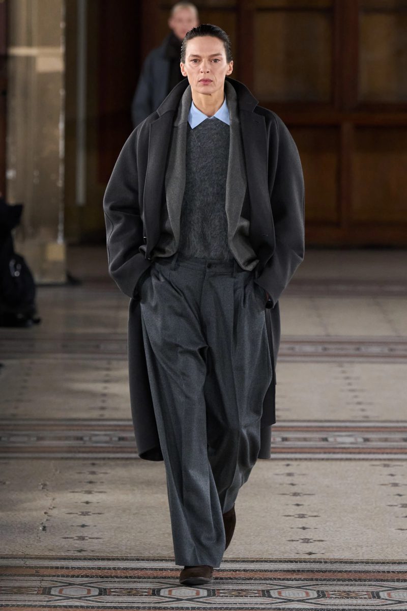 At Hermès, the week reached a quiet emotional peak. Véronique Nichanian presented her final menswear collection after 37 years at the house, and received a standing ovation—not for spectacle, but for constancy. Her farewell was composed of what she has always done best: clean lines, sensual materials, and color used sparingly, like punctuation. Terracotta, blues, pinstripes, étrivière stitching, double lambskin lapels, off-center pockets—each detail refined, never ornamental. Reversible cashmere travel coats, full-grain leather jackets, double-breasted leather suits suggested clothes meant to live across decades, not seasons. In a fashion system addicted to acceleration, Nichanian’s legacy felt quietly radical: endurance as luxury.