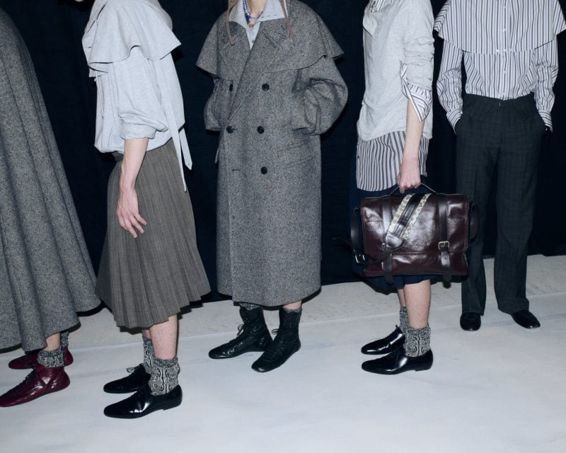 At Dries Van Noten, under the guidance of Julian Klausner, the mood shifted inward. His collection was framed as a coming-of-age story—but not the dramatic, romantic kind. Instead, it celebrated the joy of beginning again. Clothes felt lived-in, emotionally weighted, as if inherited rather than purchased. School-uniform tailoring dissolved into blurred floral prints that looked like Polaroids left too long in the sun. Kilts and flat shoes stayed close to the ground, suggesting movement rather than display. Wool, Shetland, jacquards, flannels—materials associated with comfort and memory—formed the backbone, while oversized soft bags and lucky-charm accessories hinted at personal rituals. This was fashion as companion, not armor. A wardrobe meant to remember you back.