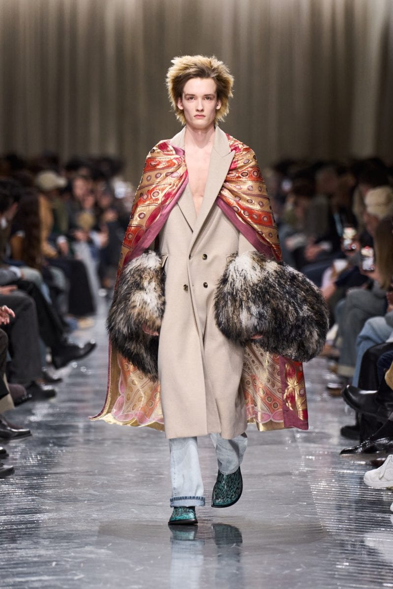 At Dior Homme, Jonathan Anderson—showing in the gardens of the Musée Rodin—offered an aristocratic youth liberated from inherited stiffness. His was a Dior that flirted with excess but never drowned in it: yellow eccentric wigs by Guido Palau, embroidered epaulettes stitched onto polo shirts, faux-fur cuffs and soft sheepskin that suggested wealth worn lightly rather than guarded jealously. Anderson looked to Paul Poiret, the early 20th-century designer who freed the body from corsetry, and translated that philosophy into a contemporary study of contradiction: Napoleonic jackets colliding with workwear, acid-washed denim brushing up against metallic silk deep-V tops, capes swelling with volume yet controlled by Dior’s institutional polish. Masculine and feminine blurred—not as provocation, but as fact. This was affluence without anxiety, elegance without severity.