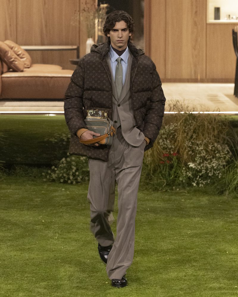 If Dior proposed aristocracy rediscovered, Louis Vuitton imagined luxury reengineered. Pharrell Williams titled his collection Timeless Textiles, and staged it inside a transparent structure called the “DROPHAUS,” a conceptual ecosystem of sound, craft, and celebrity. Precision was the operative word: houndstooth and herringbone suits woven with reflective threads, shirts constructed with aluminum, reversible bags reinforced with titanium hardware. Even softness arrived via innovation—hand-embroidered wool engineered to behave like neoprene, mink bombers mimicking toweling. Raindrop embroidery became both motif and metaphor: luxury as something that falls, accumulates, and resh