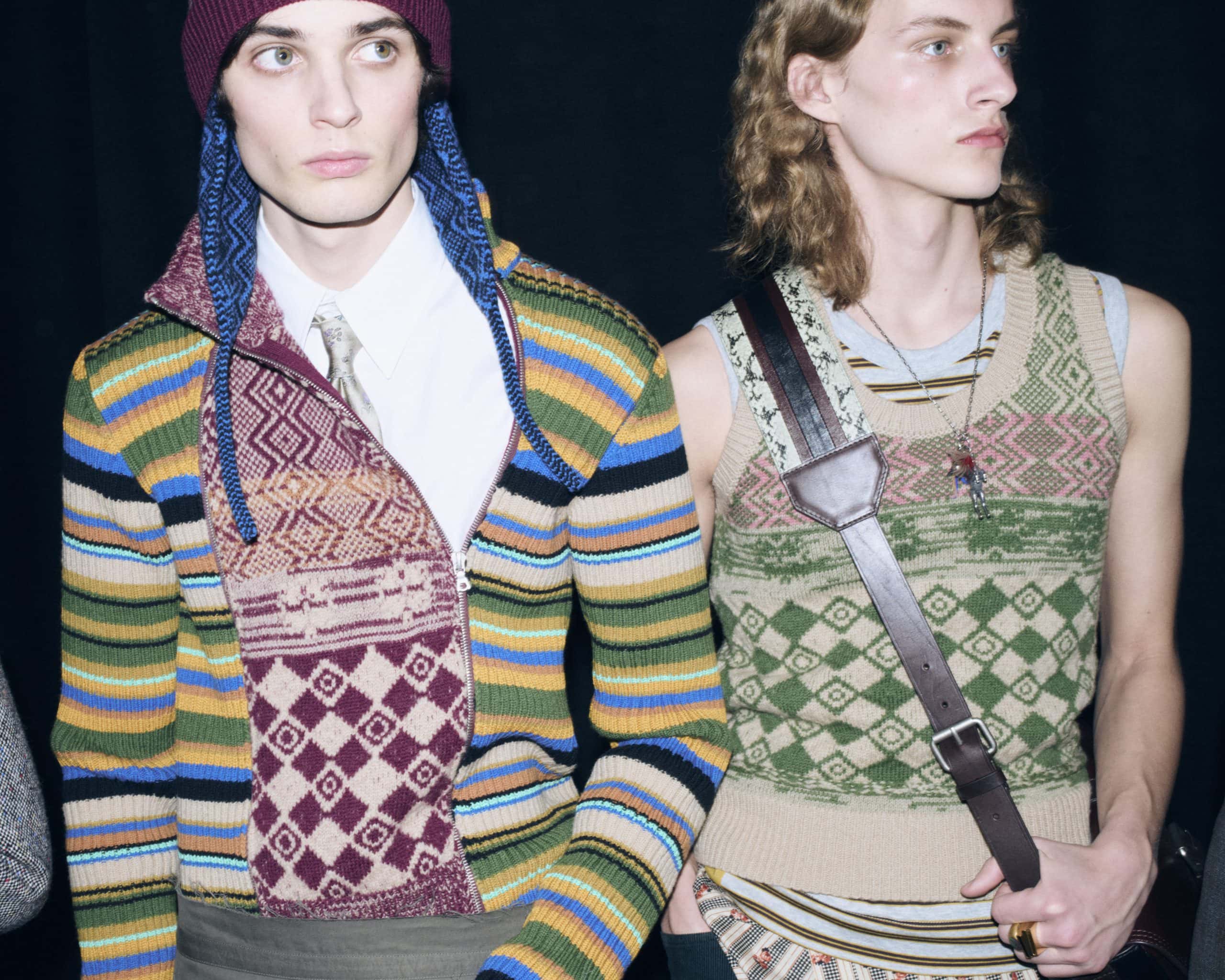 At Dries Van Noten, under the guidance of Julian Klausner, the mood shifted inward. His collection was framed as a coming-of-age story—but not the dramatic, romantic kind. Instead, it celebrated the joy of beginning again. Clothes felt lived-in, emotionally weighted, as if inherited rather than purchased. School-uniform tailoring dissolved into blurred floral prints that looked like Polaroids left too long in the sun. Kilts and flat shoes stayed close to the ground, suggesting movement rather than display. Wool, Shetland, jacquards, flannels—materials associated with comfort and memory—formed the backbone, while oversized soft bags and lucky-charm accessories hinted at personal rituals. This was fashion as companion, not armor. A wardrobe meant to remember you back.