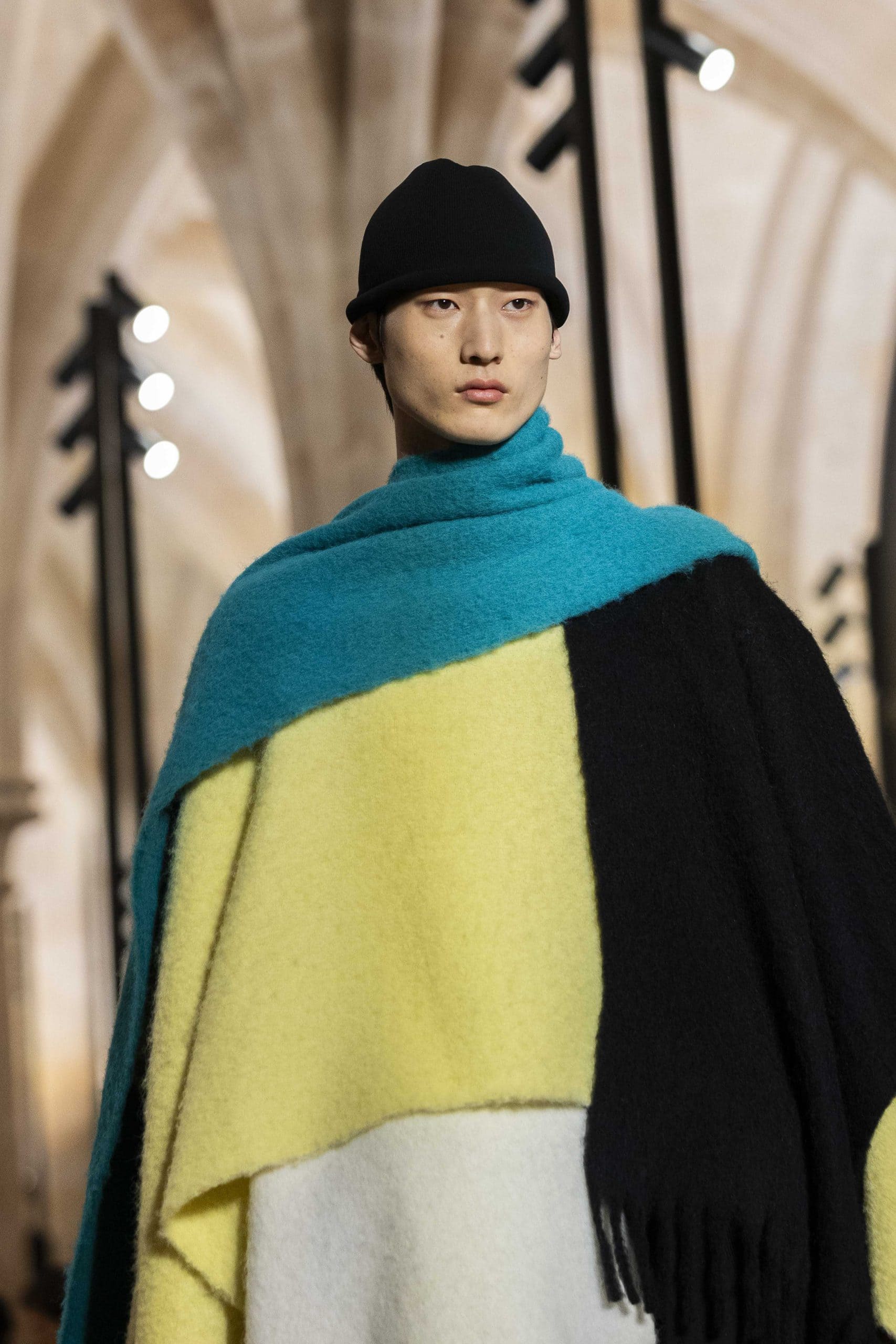 That idea—clothing as something that adapts to the human, rather than the other way around—was made literal at IM Men by Issey Miyake. Presented at the Collège des Bernardins, the collection, titled Formless Form, followed the house’s foundational principle: begin with a single piece of cloth and let it discover its own life. Through a series of named techniques—CLAY, DAWN, OVERLAP, GRADATION WOOL, LEATHER PLEATS—garments shifted, layered, converted. Capes unfolded in three-tone gradients recalling skies at dusk; cotton and nylon blends created sculptural silhouettes that never restricted movement. Eco-conscious materials, including recycled polyester, reinforced the sense that innovation here was ethical as well as aesthetic. These were clothes designed not to dominate the body, but to collaborate with it.