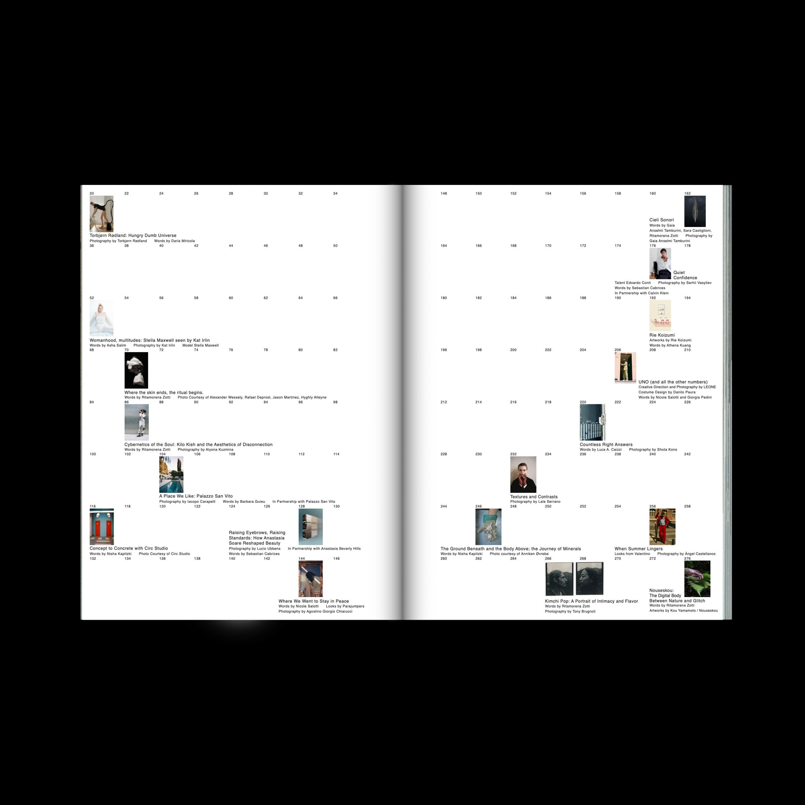 FEATURED IN THIS ISSUE: P.20 TORBJØRN RØDLAND, P.52 STELLA MAXWELL BY KAT IRLIN, P.70 ALEXANDER WESSELY, P. 86 KILO KISH, P.104 PALAZZO SAN VITO, P.116 CIRC STUDIO AND SARA BOKR, P.128 ANASTASIA BEVERLY HILLS, P.144 PARAJUMPERS, P.162 CIELI SONORI, P. 176 EDOARDO CONTE X CALVIN KLEIN, P. 192 RIE KOIZUMI, P.206 UNO, P.220 SHOTA KONO, P.232 LALA SERRANO, P.246 ANNIKEN ØVREBØ, P.256 ANGEL CASTELLANOS X VALENTINO, P.266 KIMCHI POP, P.276 NOUSESKOU.