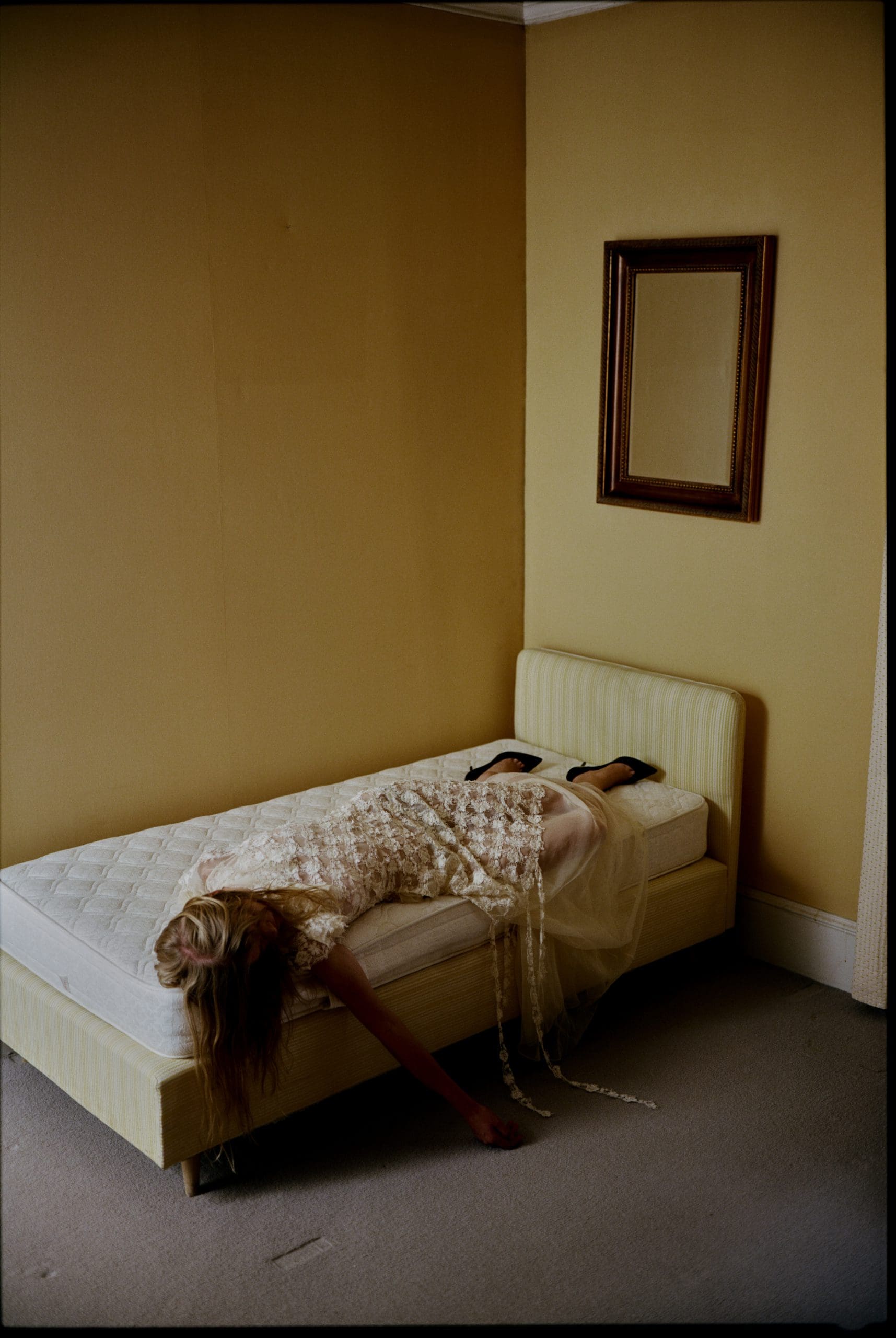 The most contemplative shot depicts the protagonist in a small, cramped room dominated by a bed and a picture frame, both of which fill the space. The lighting is yellow and warm, but the feeling it evokes is anything but warm. The model is lying on the bed, face down, one arm dangling. It serves as a portrait of profound loss, even if not explicit. In this slowness, in this pose that evokes death. Just as in Munch’s paintings, the heaviness is present, sometimes barely suggested, never striking but inexorable.