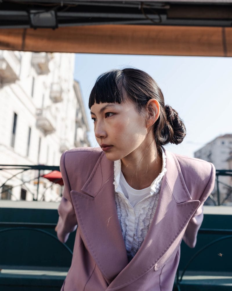 The work of photographer Niccolò Morrone visually explores the duality between stillness and movement. In the early images, Meng’s figure is often framed by architectural elements such as grates and metal structures. The composition suggests a sense of confinement, with the city becoming a narrative element, defining the spatial limits of the subject. The urban environment is perceived as a rigid structure and amplifies the static nature of the clothing.