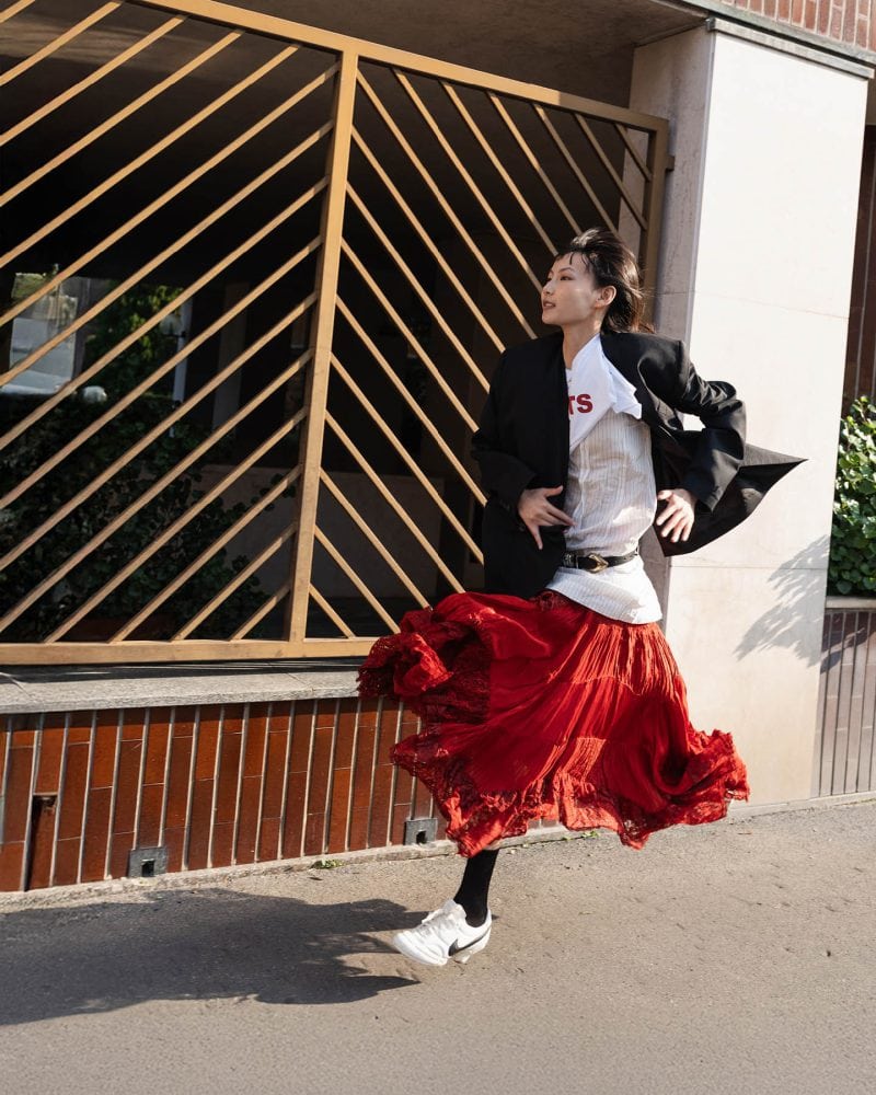 The series, while initially characterised by staticity, shows an evolution. Towards the end, the narrative lightens and takes on a more dynamic rhythm. In the final scenes, the protagonist makes an unexpected gesture, running, disrupting the formal setting. The red skirt, which swirls outwards, is a visual representation of liberation. After a period of immobility, the image culminates in an explosion.