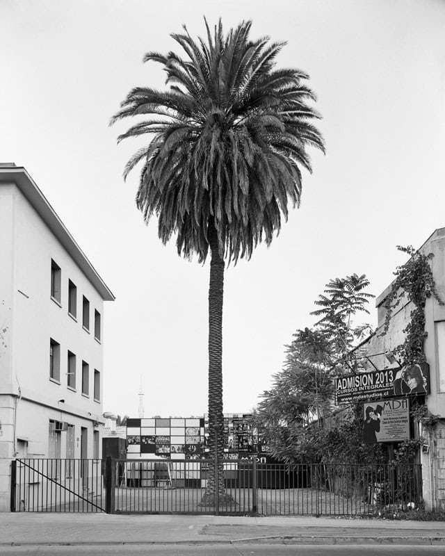 The palm tree caught my attention because it is immediately recognizable and yet an incongruous presence in Santiago de Chile. It is a powerful vertical line marking the urban landscape. The trunk rising up above translates a strategy for survival: concentrating the energy in order to reach high up for sunshine and avoid the shade of surrounding trees, an interesting evolutionary solution. The way in which it defies gravity is also moving to me. We are all confronted with similar constraints, and the palm tree elegantly handles them, reaching up above our heads like a monument that has witnessed the city changing at its feet.