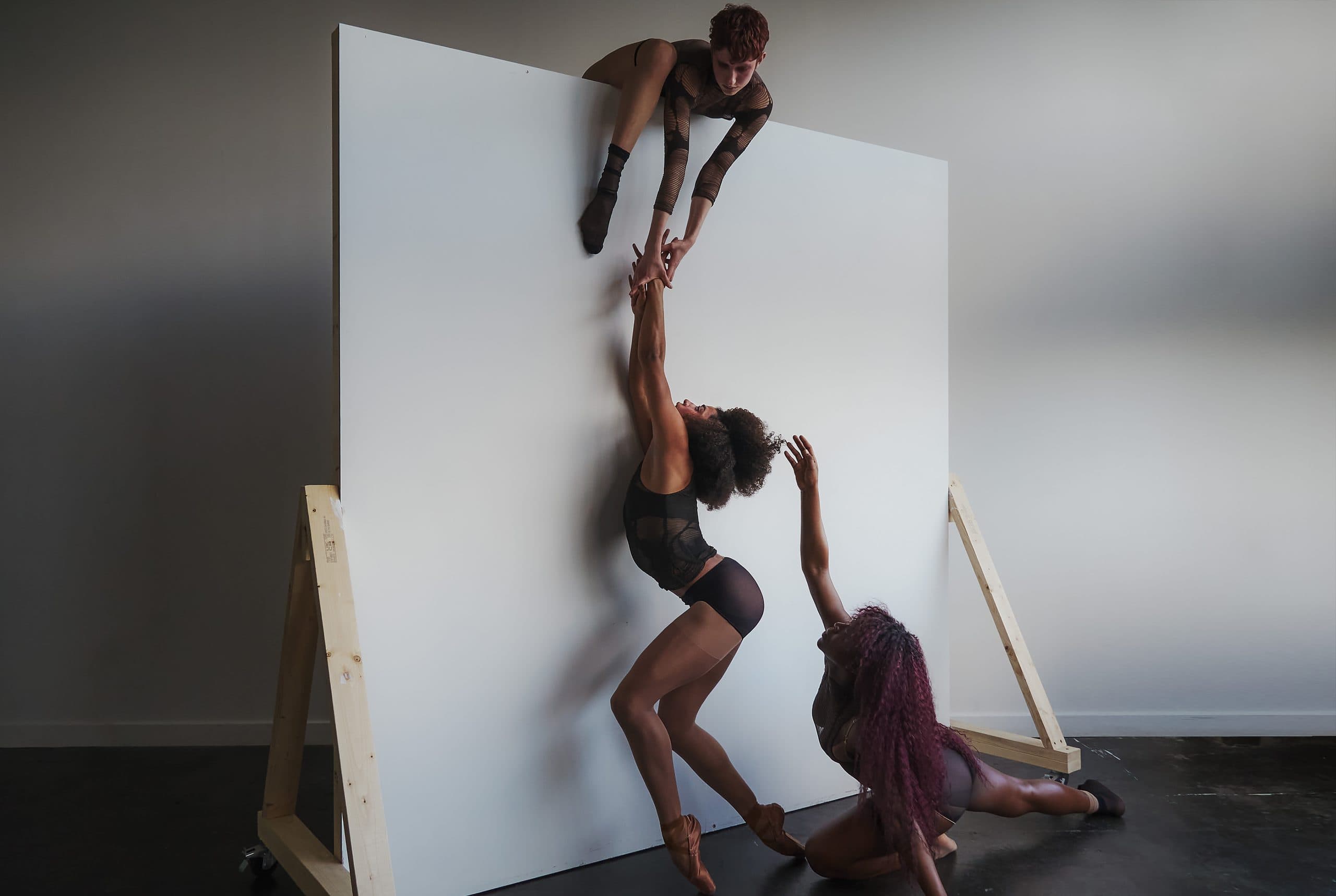 The series explores the theme of uncertainty, accentuated by the transoceanic origin of the movement instructions, transmitted via a screen. Distance is integrated into the choreography, in which the artist seeks guidance and support from an often dispersed but fundamental community. Communication between the individual and the collective pervades the entire work. Individual bodies appear elastic and vulnerable. United bodies are transformed into living architectures and sculptures, evoking body art and contemporary sculpture, in which the human figure becomes material to be composed and decomposed. The fashion element contrasts with the bare environment of the rehearsal room. Transparent bodysuits, fishnet stockings and sequins cling to the movements like a second performative skin. The aesthetic, reminiscent of clubbing and editorial fashion, takes on an almost dissonant value, as if desire and gender were represented in a neutral space, devoid of superfluous elements.