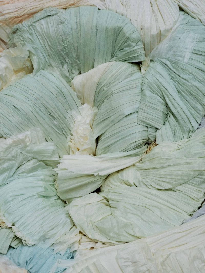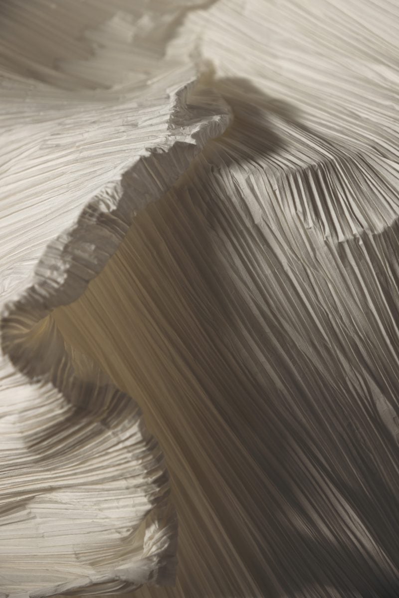 AK: Originally, this paper protected fabric as it moved through the pleating machine. In Shell, it becomes the visible, final surface. What does it mean to elevate a protective intermediary into the primary architectural gesture?