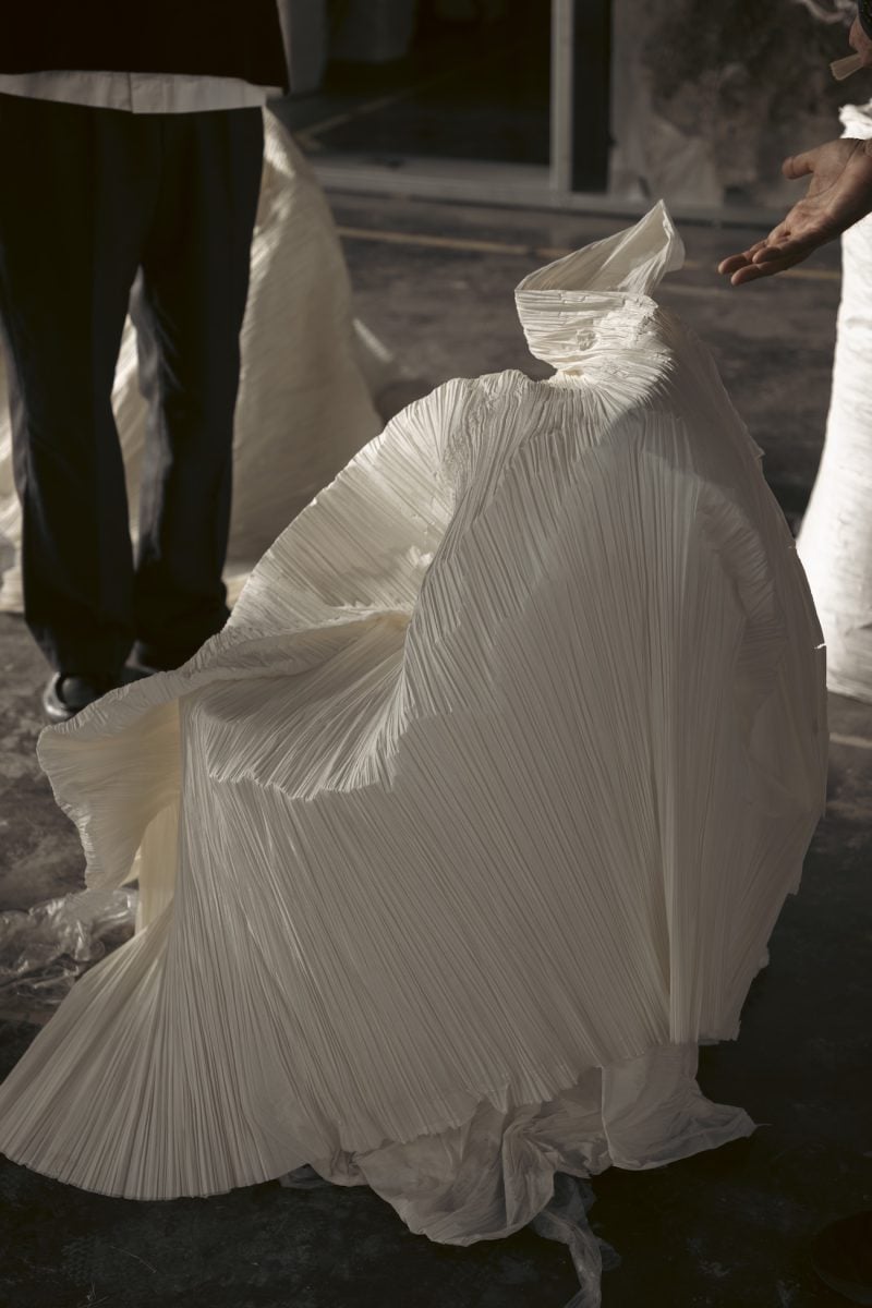So, I would say that the materials of Issey Miyake are paper and the garment. The garment is the visible part. The paper is the invisible. We’re revealing that invisibility through another space. But I think it retains the memory of the garment.
