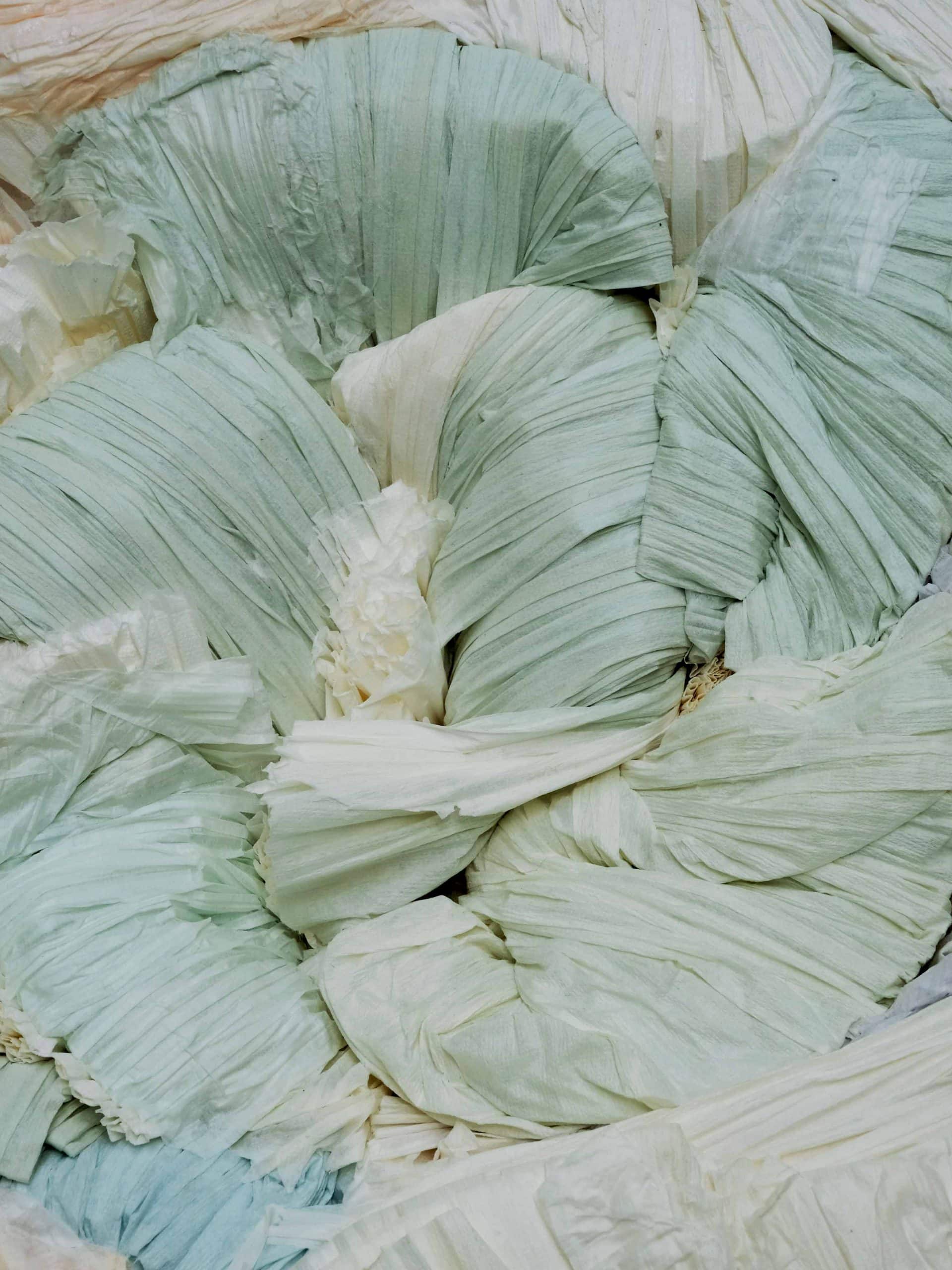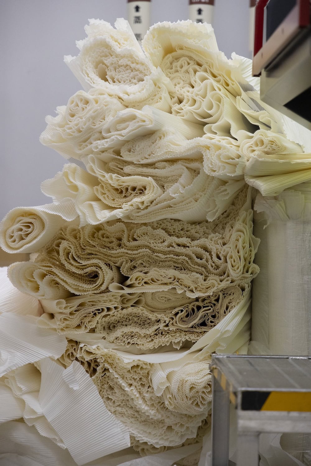 AK: Originally, this paper protected fabric as it moved through the pleating machine. In Shell, it becomes the visible, final surface. What does it mean to elevate a protective intermediary into the primary architectural gesture?
